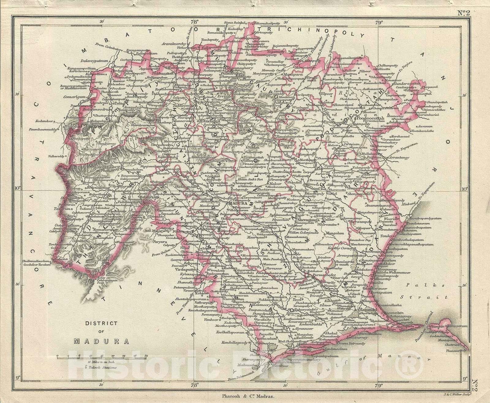 Historic Map : The District of Madura, Tamil Nadu, India, Pharoah, 1854, Vintage Wall Art