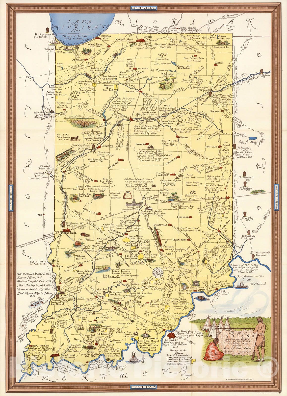 Historic Map : Indiana Showing its History, Points of Interest, and Holdings of Indiana Department of Conservation., 1954, Vintage Wall Decor