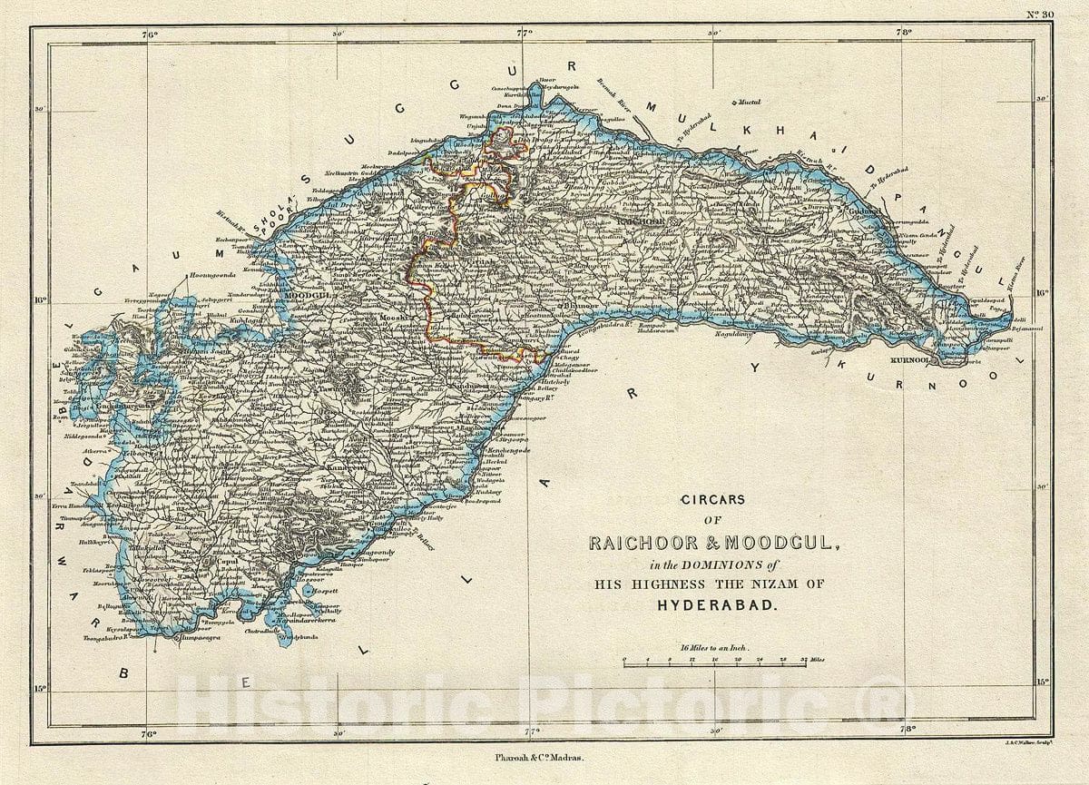 This is a nice 1854 map of the Circars or Sarkars of Raichur and Mudgul under the Nizam of Hyderabad issued by Pharoah and Company. It covers what are today the Raichur and Koppal districts in the Indian state of Karnataka and part of the Mahbubnagar d