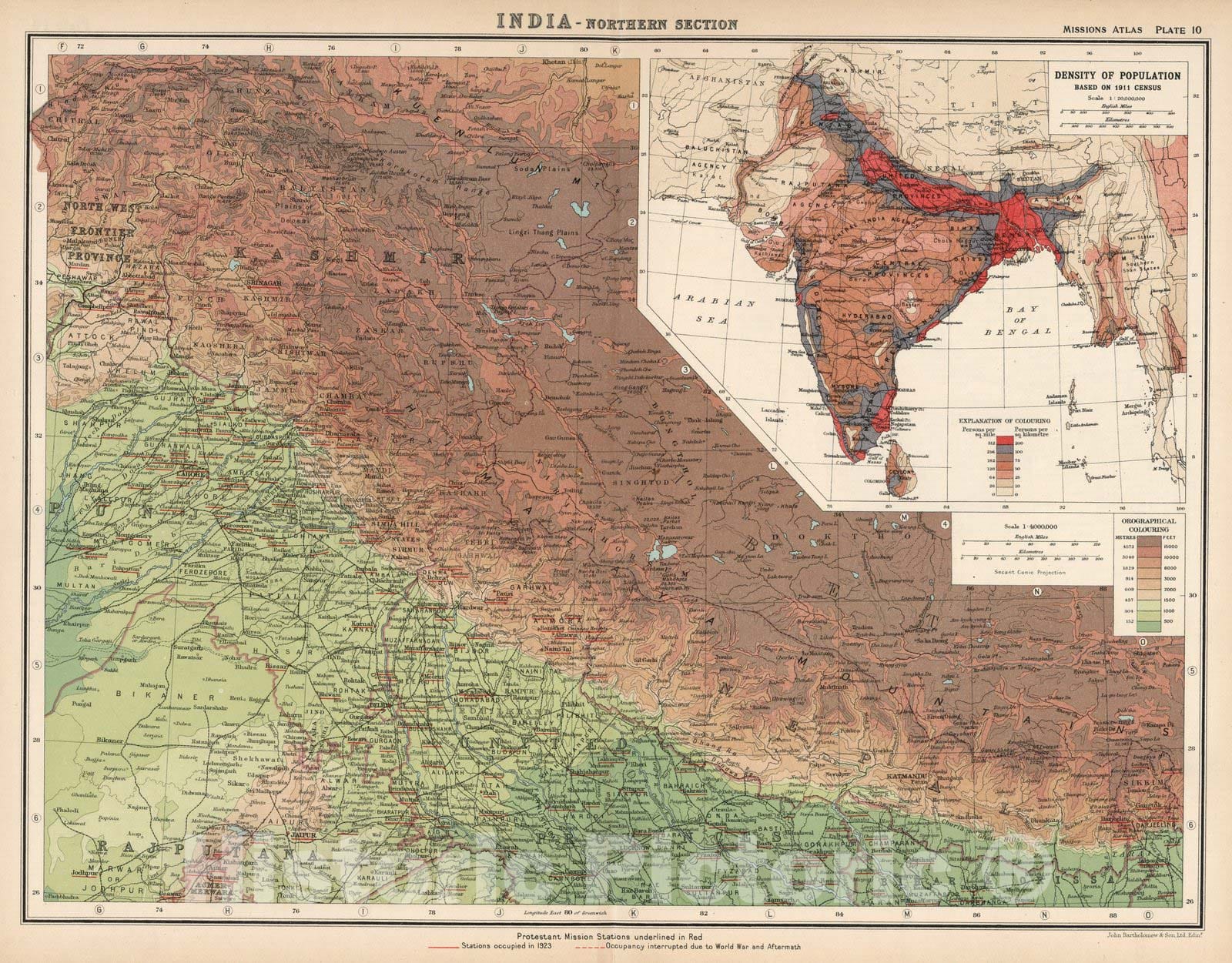 Plate 10. India - Northern Section. Density of Population based on 1911 Census. | World Missionary Atlas. Containing a Directory of Missionary Societies, Classified Summaries of Statistics, Maps Showing the Locations of Missionary Stations throughout the World, a Descriptive Account of the Principal Mission Lands, and Comprehensive Indicies. Edited by Harland P. Beach, D.D, F.R.G.S., Charles H. Fahs, B.A., B.D. Maps by John Bartholomew, F.R.G.S. of the Edinburgh Geographical Institute. New York, Institute of Social and Religious Research, 1925. | Maps in full color. Relief is shown by hypsometric tints.