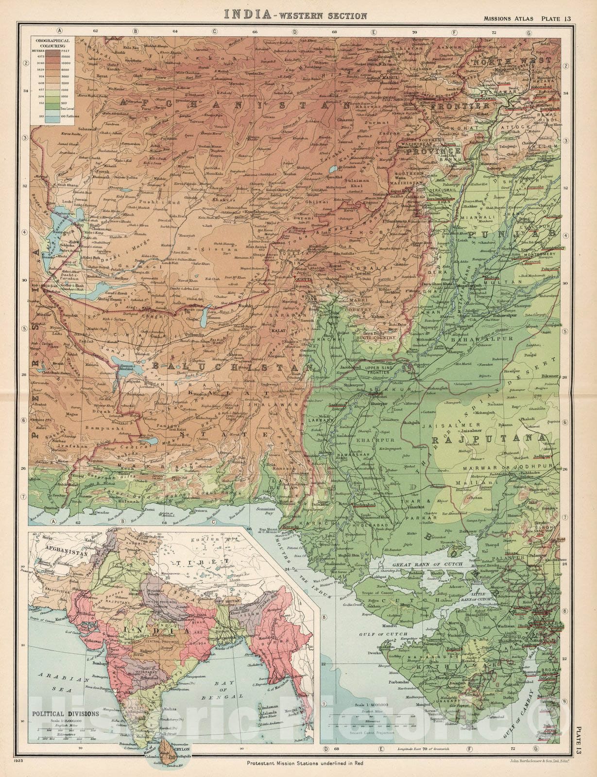 Plate 13. India - Western Section. | World Missionary Atlas. Containing a Directory of Missionary Societies, Classified Summaries of Statistics, Maps Showing the Locations of Missionary Stations throughout the World, a Descriptive Account of the Principal Mission Lands, and Comprehensive Indicies. Edited by Harland P. Beach, D.D, F.R.G.S., Charles H. Fahs, B.A., B.D. Maps by John Bartholomew, F.R.G.S. of the Edinburgh Geographical Institute. New York, Institute of Social and Religious Research, 1925. | Maps in full color. Relief is shown by hypsometric tints.