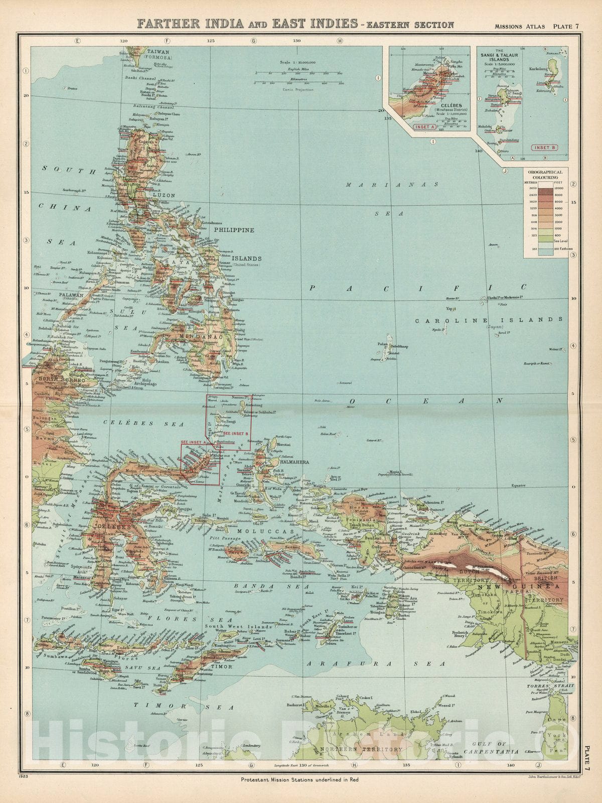 Plate 7. Farther India and East Indies - Eastern Section. | World Missionary Atlas. Containing a Directory of Missionary Societies, Classified Summaries of Statistics, Maps Showing the Locations of Missionary Stations throughout the World, a Descriptive Account of the Principal Mission Lands, and Comprehensive Indicies. Edited by Harland P. Beach, D.D, F.R.G.S., Charles H. Fahs, B.A., B.D. Maps by John Bartholomew, F.R.G.S. of the Edinburgh Geographical Institute. New York, Institute of Social and Religious Research, 1925. | Maps in full color. Relief is shown by hypsometric tints.