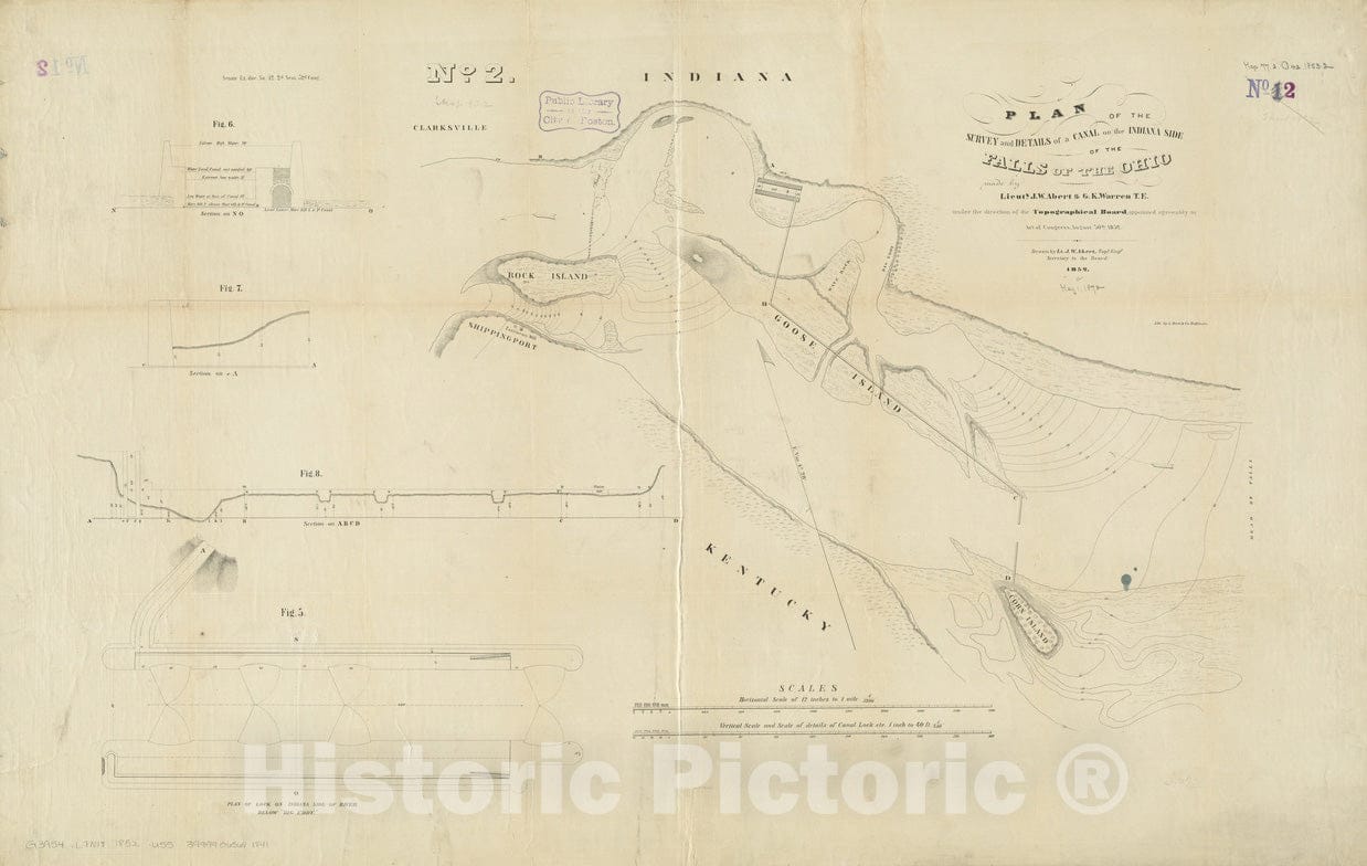 Historical Map, 1852 Plan of the survey and details of a canal in the Indiana side of the Falls of the Ohio, Vintage Wall Art