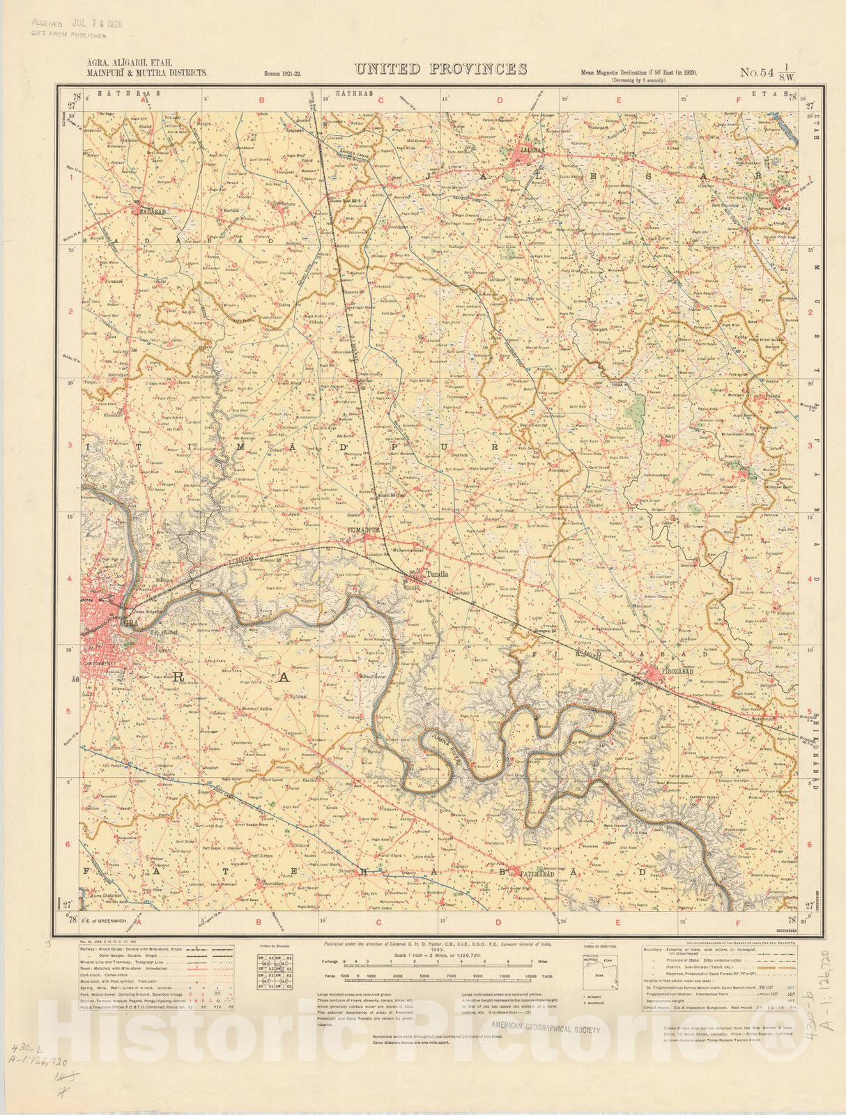 Map : Agra, Aligarh, Etah, Mainpuri & Muttra Districts, United Provinces, No. 54 I/S.W. 1923, India and adjacent countries, Antique Vintage Reproduction
