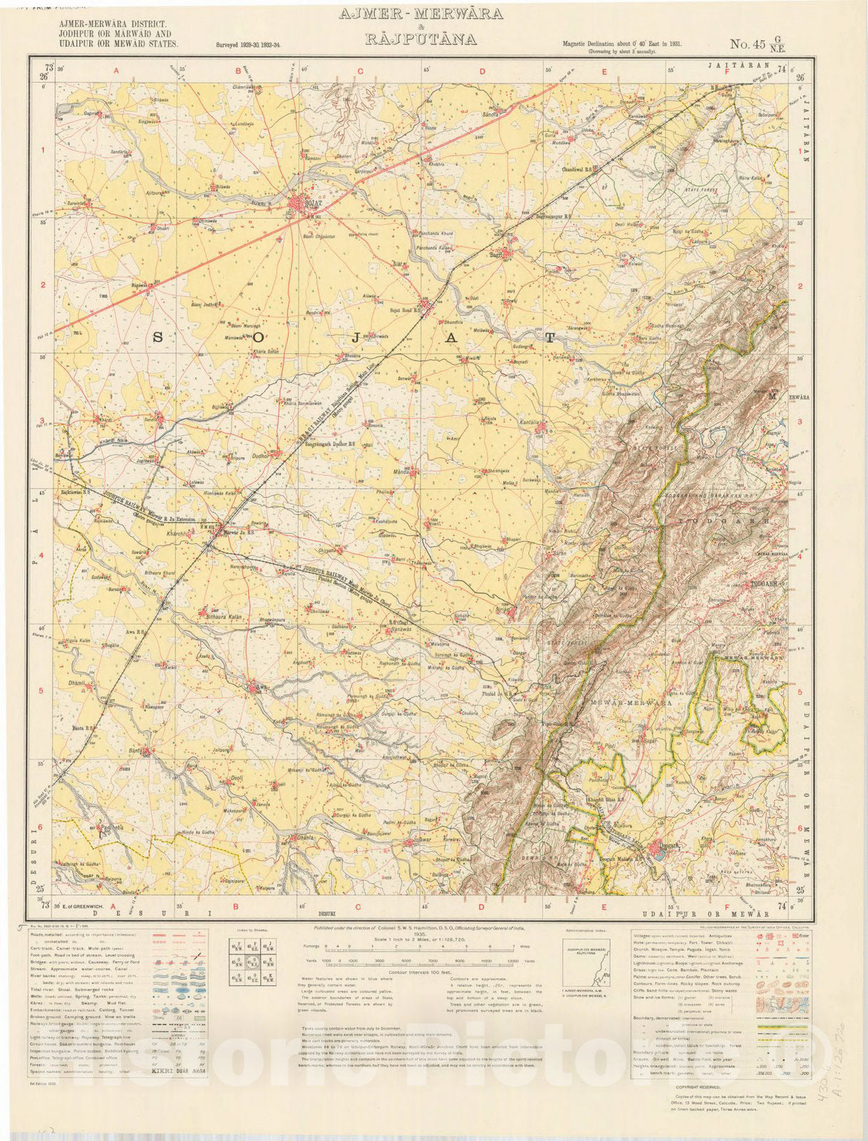 Map : Ajmer-Merwara District, Jodhpur (or Marwar) and Udaipur (or Mewar) States, Ajmer-Merwara & Rajputana No. 45 G/N.E. 1935, India and adjacent countries