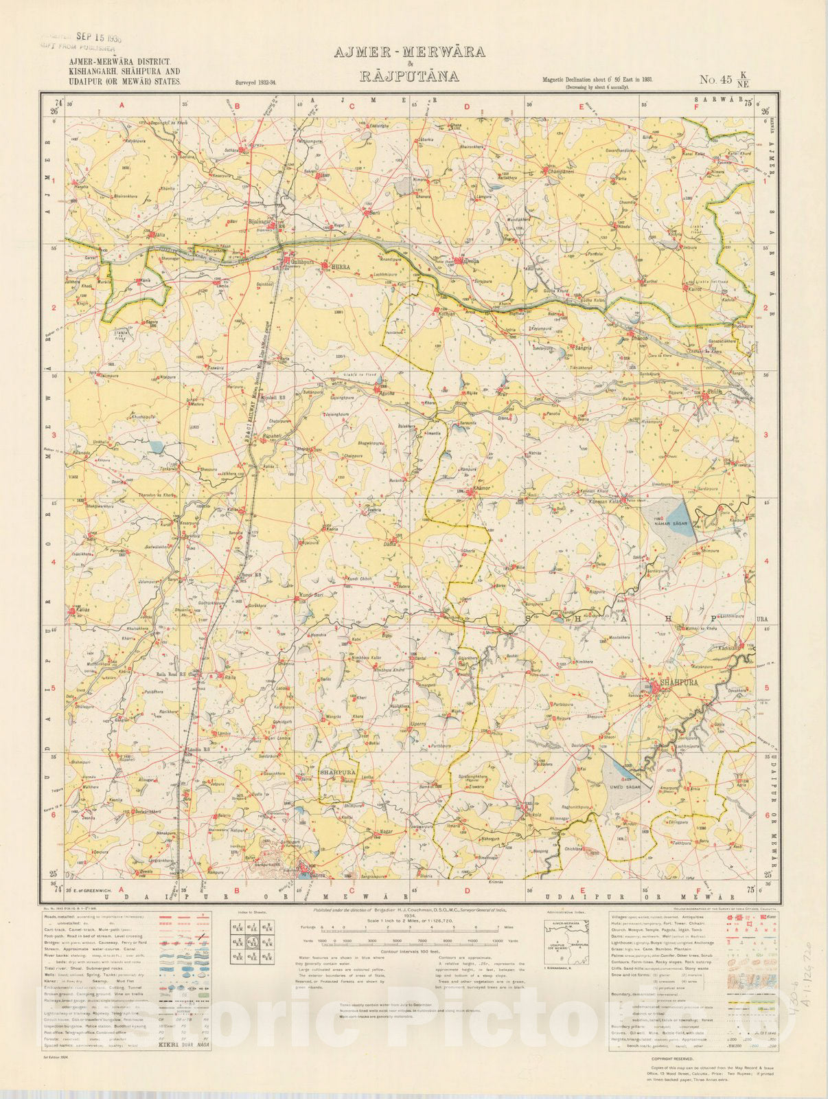 Map : Ajmer-Merwara District, Kishangarh, Shahpura and Udaipur (or Mewar) States, Ajmer-Merwara & Rajputana, No. 45 K/N.E. 1934, India and adjacent countries