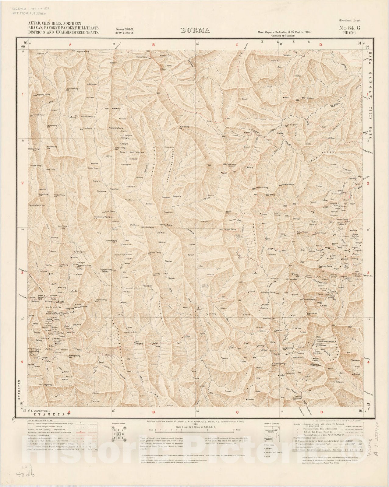 Map : Akyab, Chin Hills, Northern Arakan, Pakokku, Pakokku Hill Tracts Districts and Unadministered Tracts, Burma, No. 84 G Hilong 1920, India 1:253,440