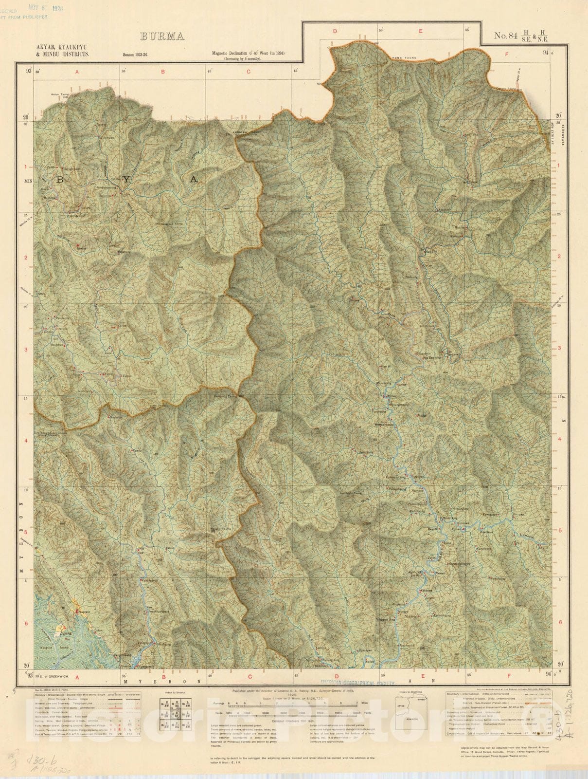 • .Map : Akyab, Kyaukpyu & Minbu Districts, Burma, No. 84 H/S.E. & H/N.E. 1925, India and adjacent countries, Antique Vintage Reproduction