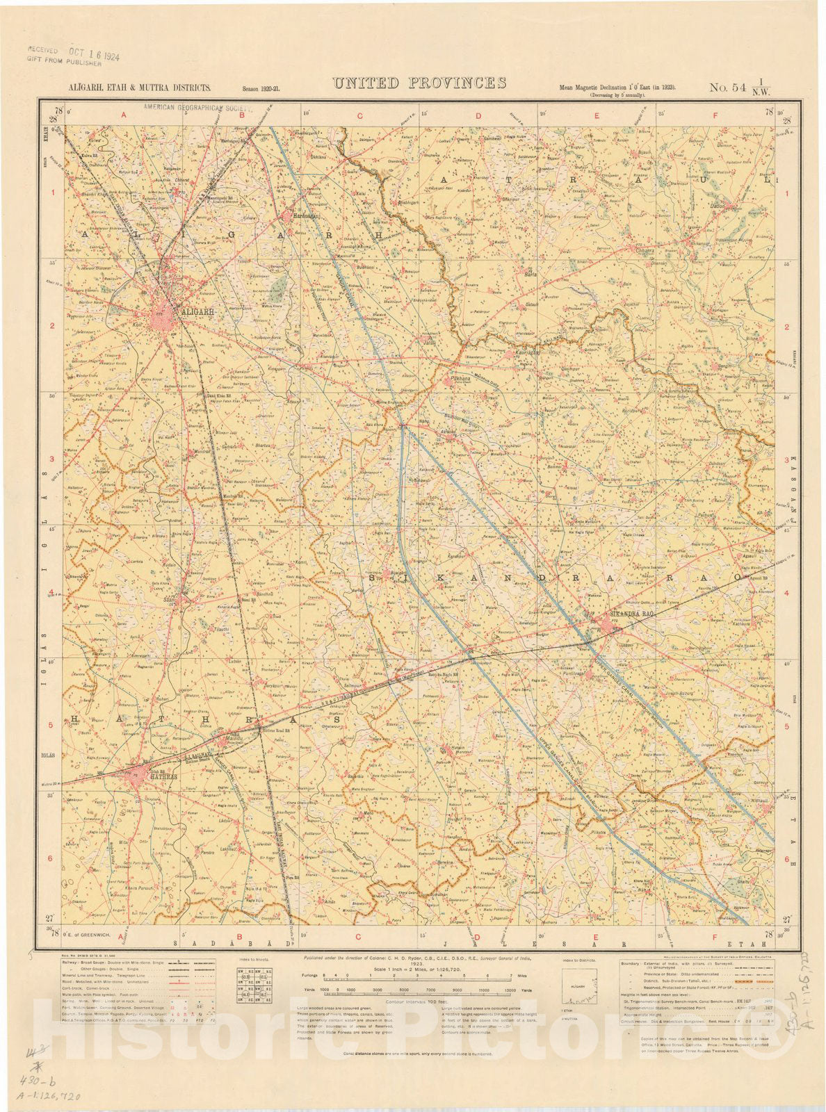Map : Aligarh, Etah & Muttra Districts, United Provinces No. 54 I/N.W. 1923, India and adjacent countries, Antique Vintage Reproduction