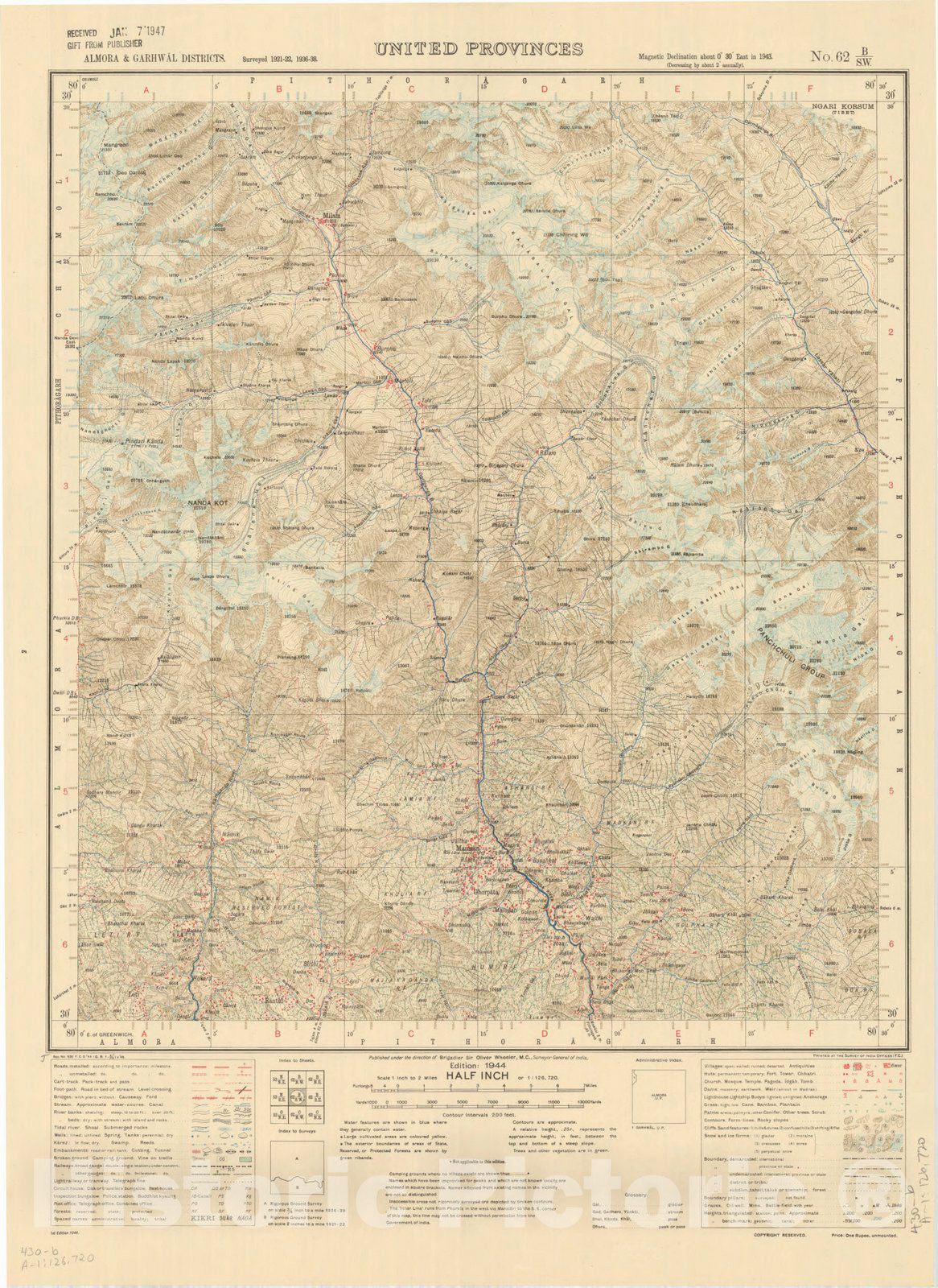 Map : Almora & Garhwal Districts, United Provinces, No. 62 B/S.W. 1944, India and adjacent countries, Antique Vintage Reproduction