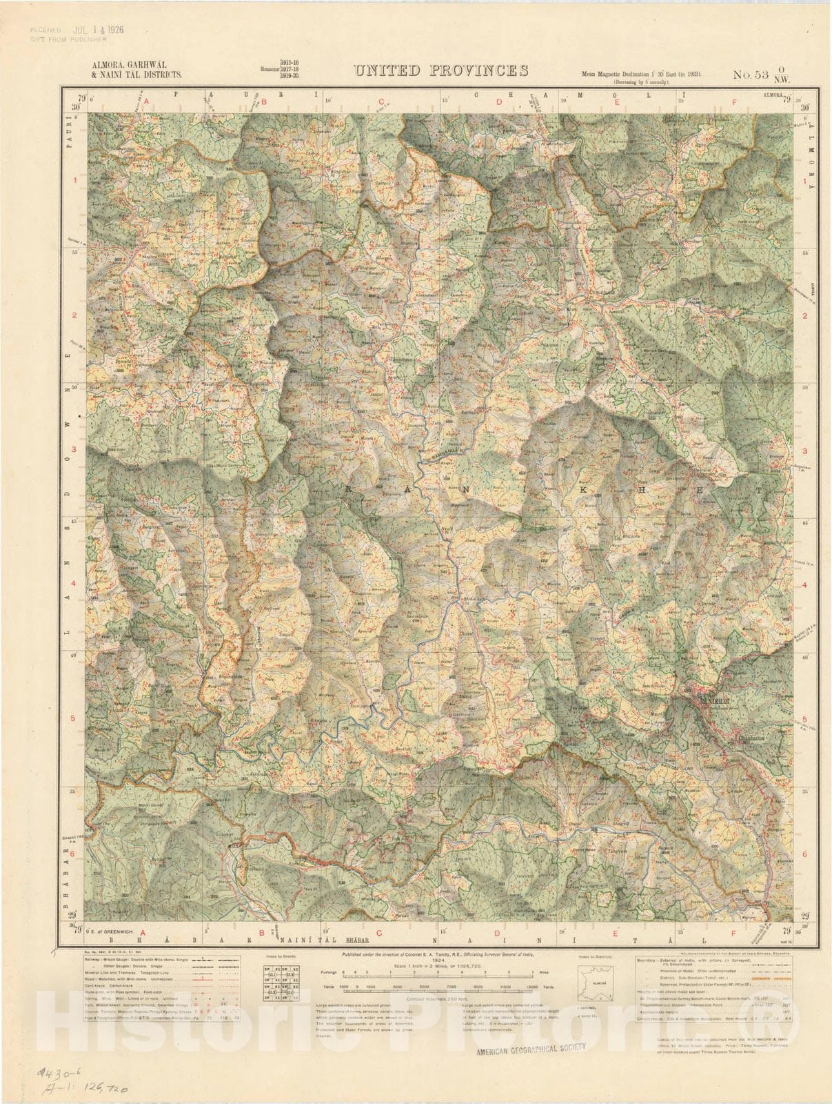 Map : Almora, Garhwal & Naini Tal Districts, United Provinces, No. 53 O/N.W. 1924, India and adjacent countries, Antique Vintage Reproduction