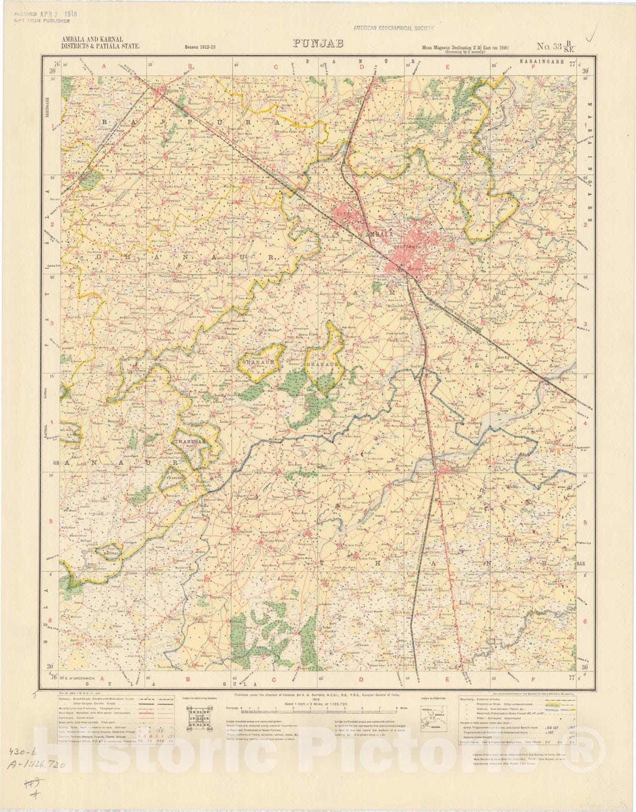 Map : Ambala and Karnal Districts & Patiala State, Punjab No. 53 B/S.E. 1916, India and adjacent countries, Antique Vintage Reproduction