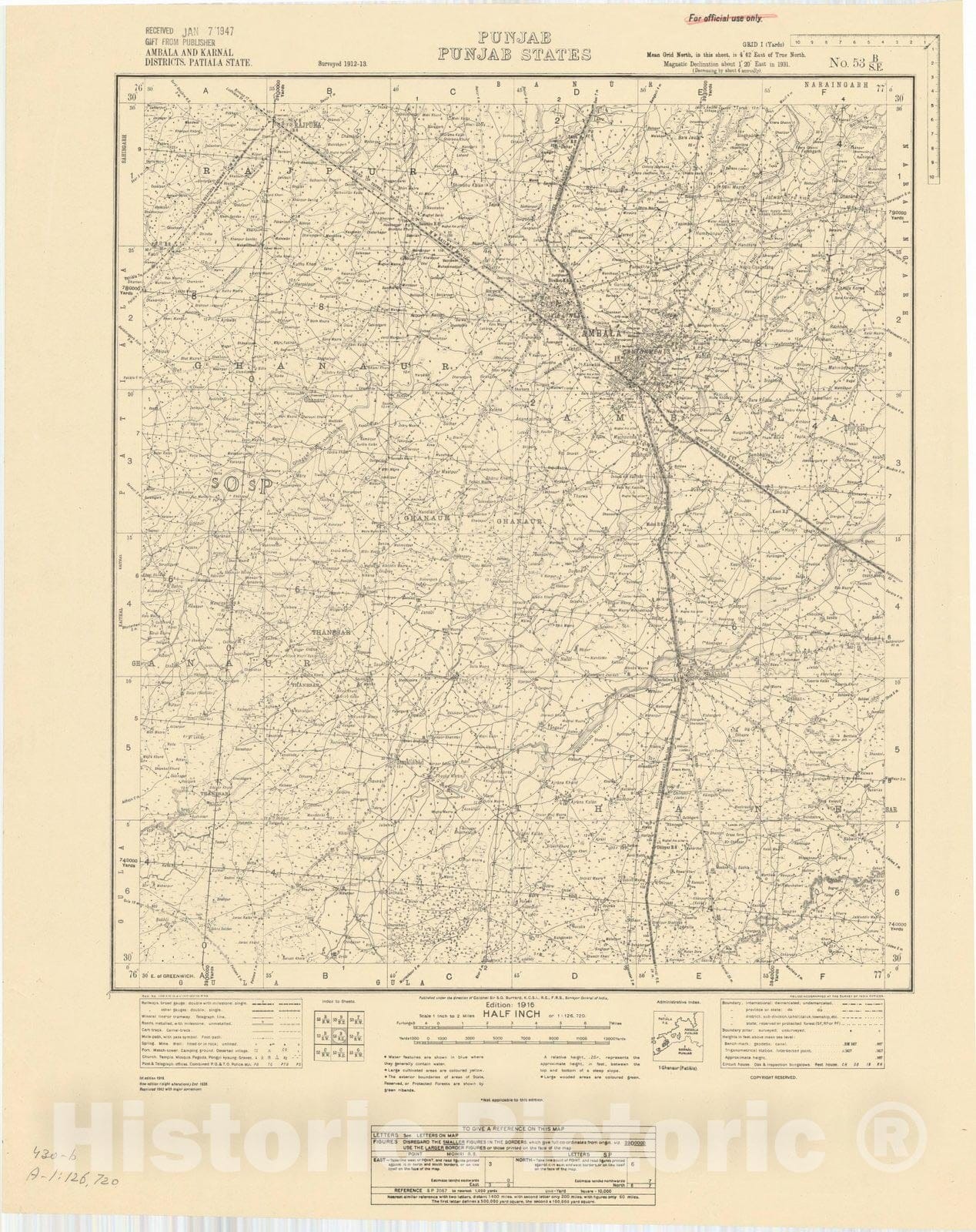 Map : Ambala and Karnal Districts, Patiala State, Punjab, Punjab States, No. 53 B/S.E. 1943, India and adjacent countries, Antique Vintage Reproduction