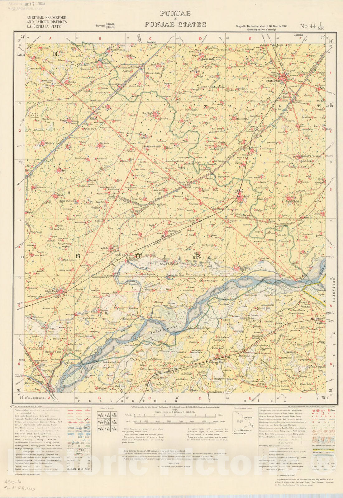 Map : Amritsar, Ferozepore and Lahore Districts, Kapurthala State, Punjab & Punjab States, No. 44 I/S.E. 1934, India 1:126,720, Antique Vintage Reproduction