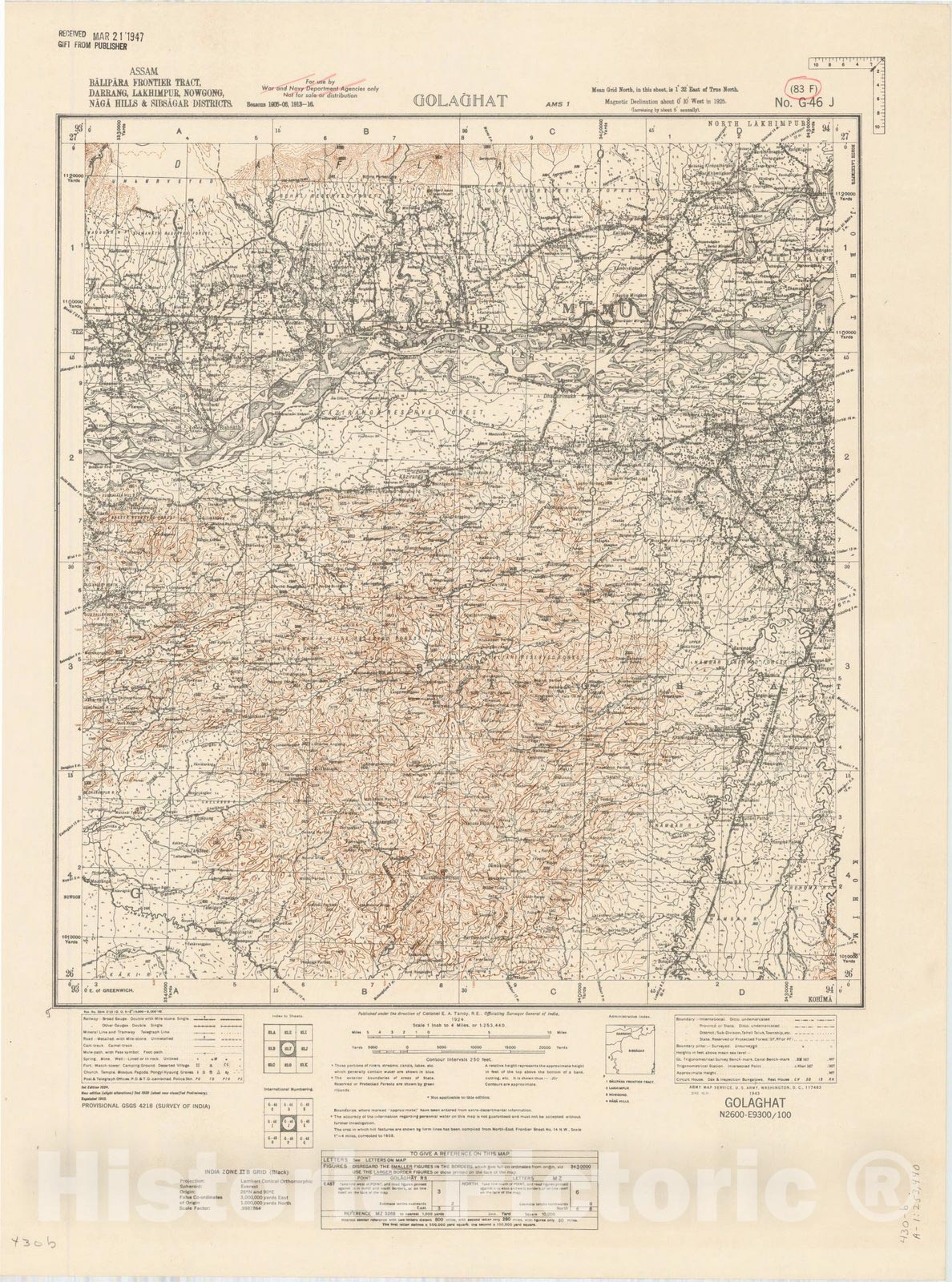 Map : Assam, Balipara Frontier Tract, Darrang, Lakhimpur, Nowgong, Naga Hills & Sibsagar Districts, Golaghat 83 F 1924, India 1:253,440, Antique Vintage Reproduction