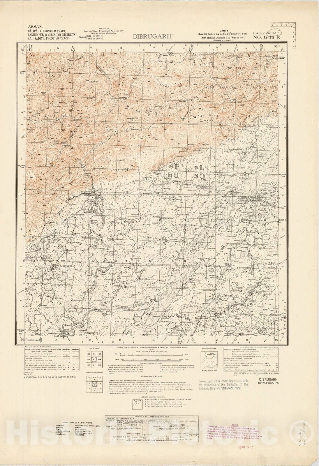 Map : Assam, Balipara Frontier Tract, Lakhimpur & Sibsagar Districts and Sadiya Frontier Tract, Dibrugarh No. 83 I 1942, India 1:253,440, Antique Vintage Reproduction