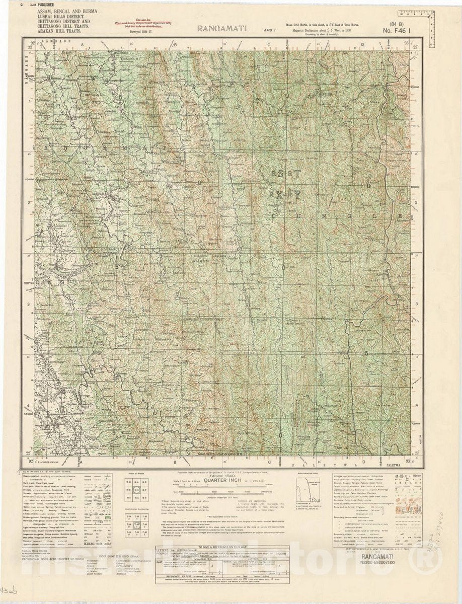 Map : Assam, Bangal and Burma, Lushai Hills District, Chittagong District and Chittagong Hill Tracts, Arakan Hill Tracts, Rangamati 84 B 1940, India 1:253,440