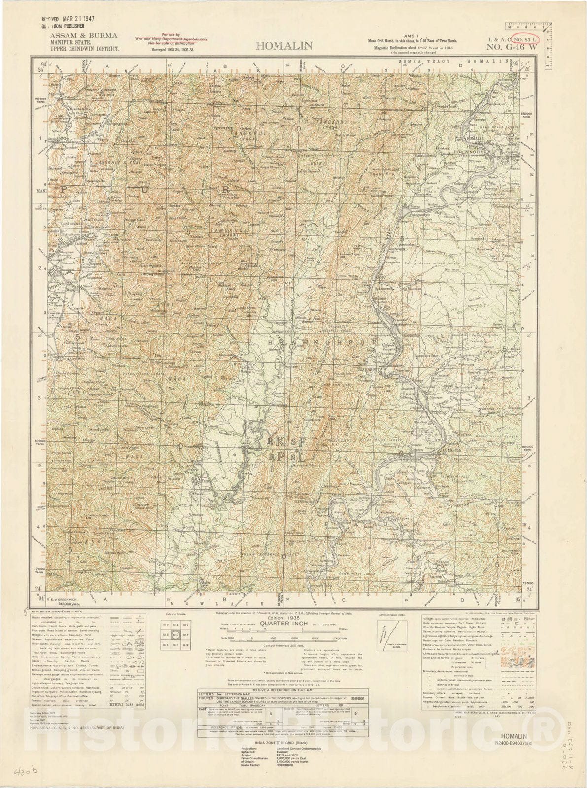 Map : Assam & Burma, Manipur State, Upper Chindwin District, Homalin, No. 83 L 1942, India 1:253,440, Antique Vintage Reproduction