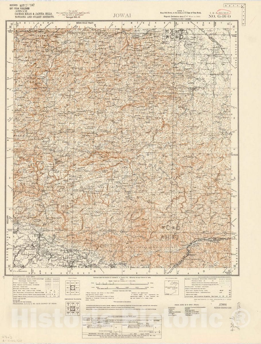 Map : Assam, Cachar, Khasi & Jaintia Hills, Nowgong andSylhet Districts, Jowai, No. 83 C 1943, India 1:253,440, Antique Vintage Reproduction