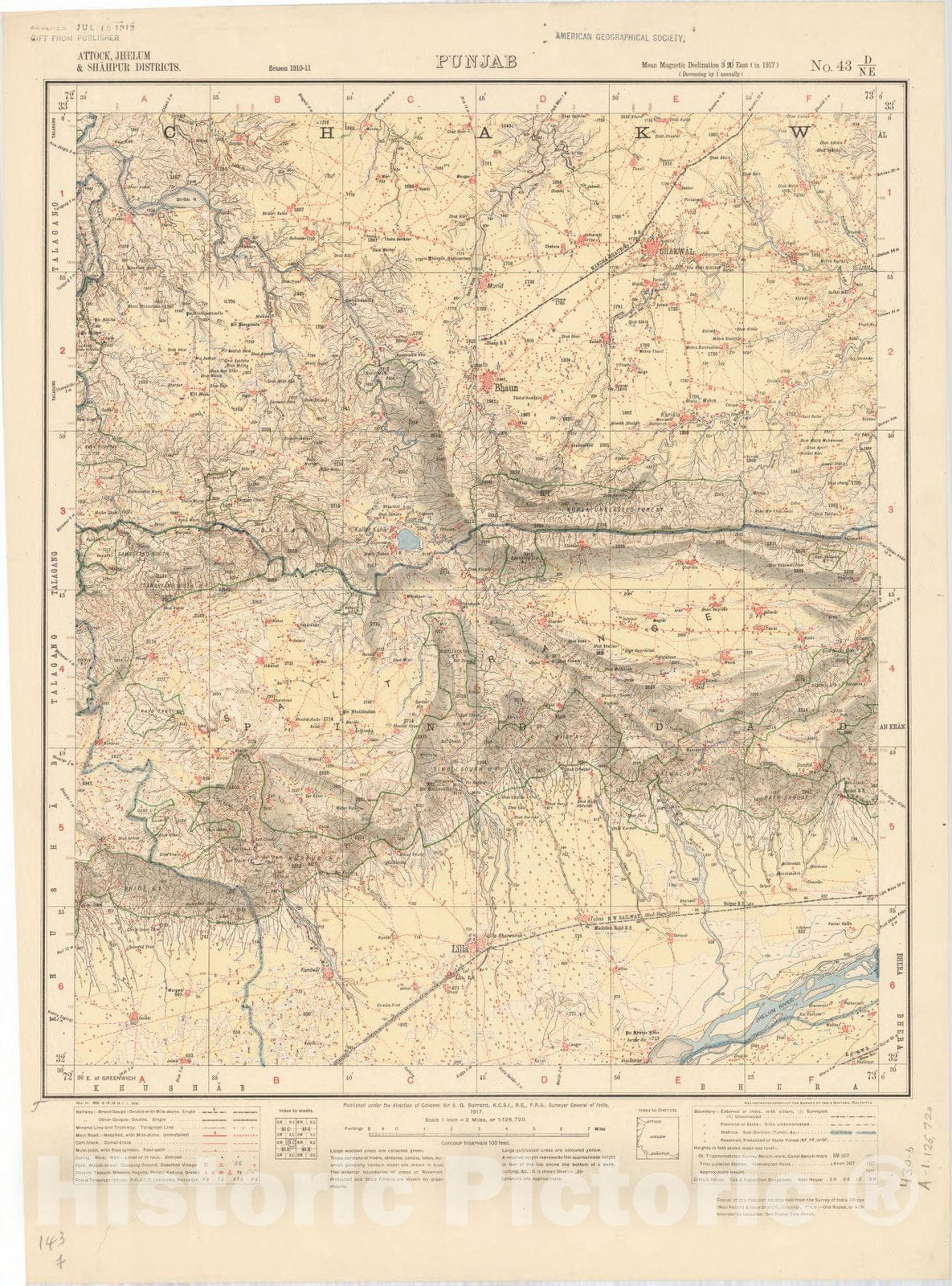 Map : Attock, Jhelum & Shahpur Districts, Punjab, No. 43 D/N.E. 1917, India and adjacent countries, Antique Vintage Reproduction