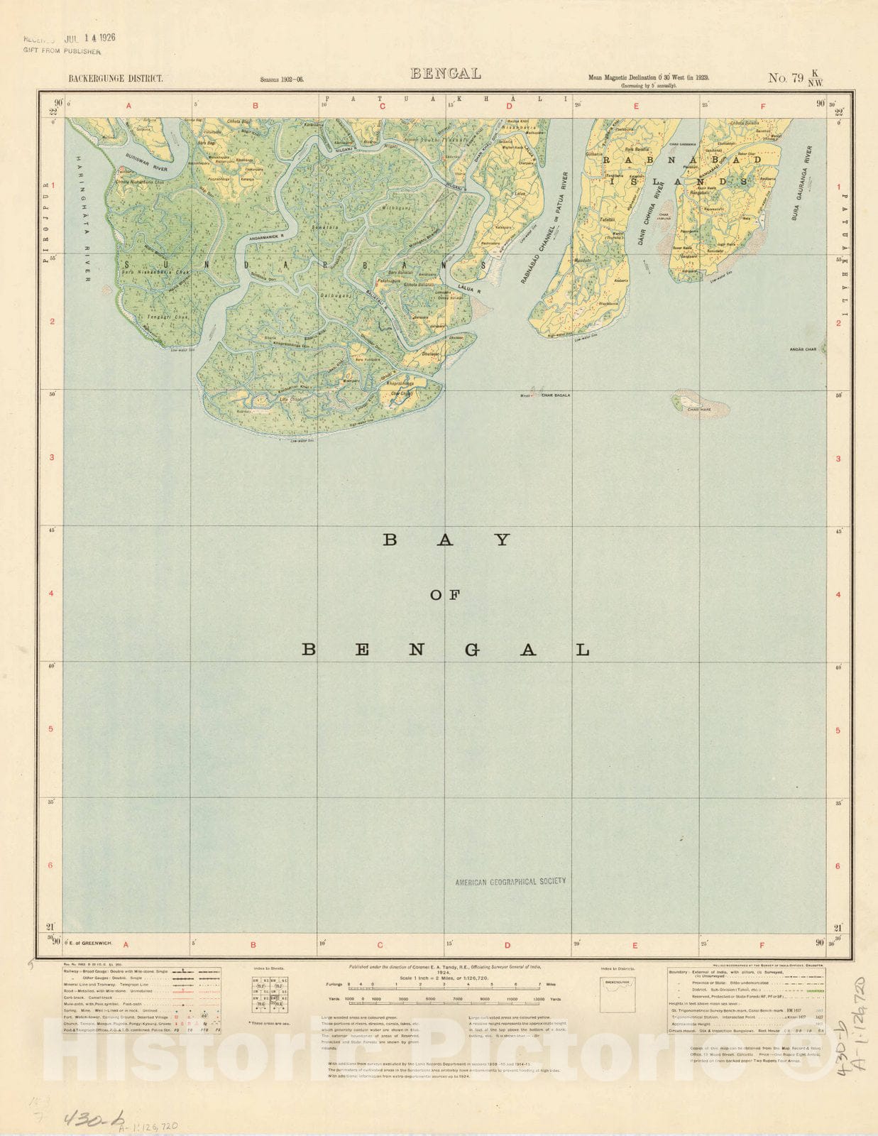 Map : Backergunge District, Bengal, No. 79 K/N.W. 1924, India and adjacent countries, Antique Vintage Reproduction
