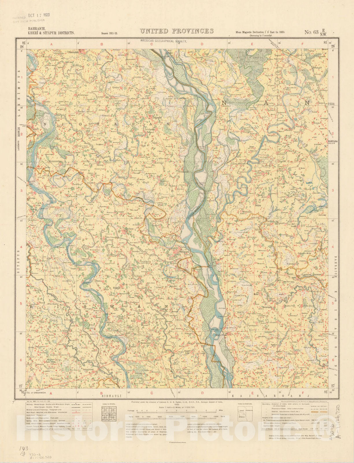 Map : Bahraich, Kheri & Sitapur Districts, United Provinces, No. 63 E/N.W. 1922, India and adjacent countries, Antique Vintage Reproduction