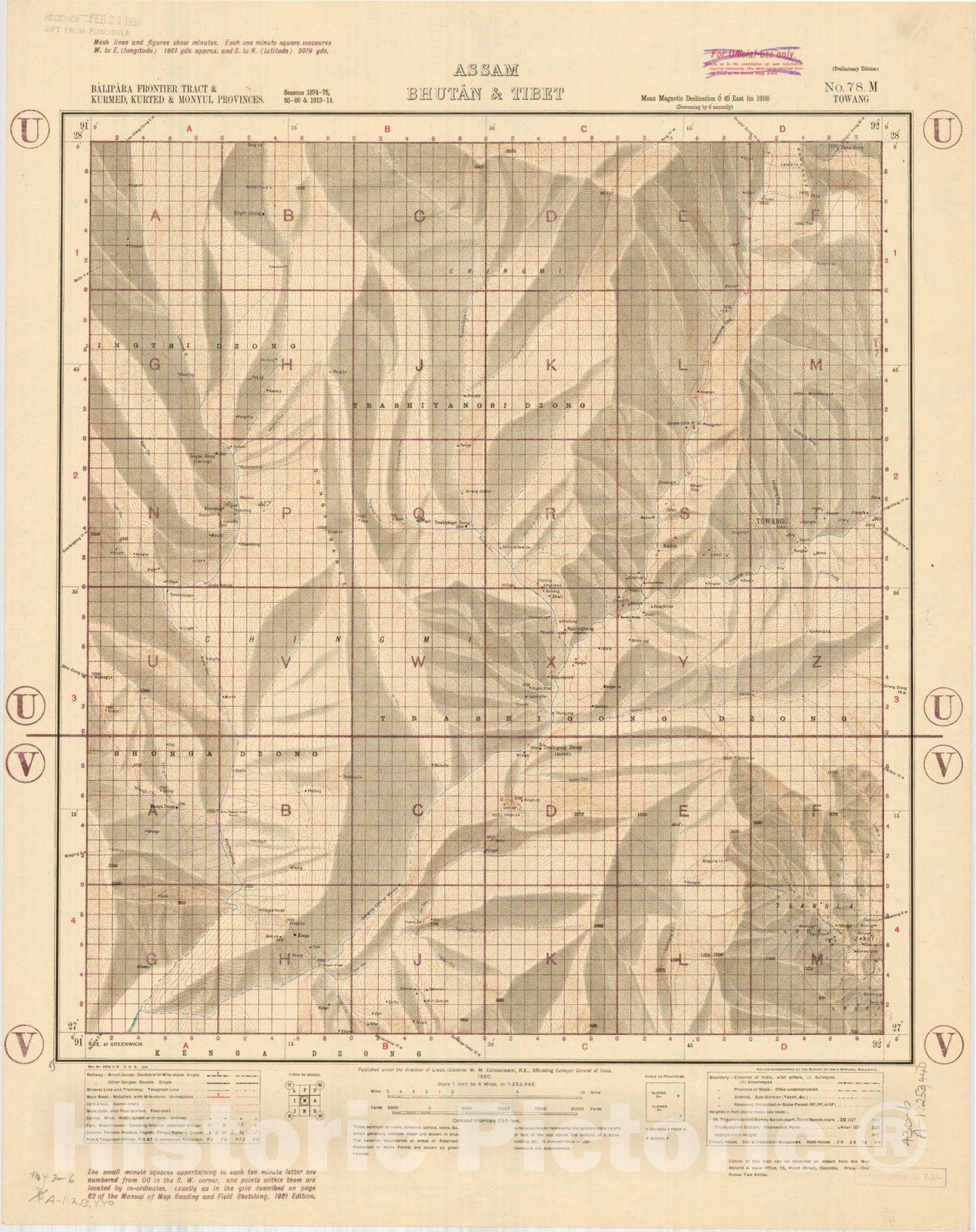 Map : Balipara Frontier Tract & Kurmed, Kurted & Monyul Provinces, Assam, Bhutan & Tibet, No. 78 M 1920, India 1:253,440, Antique Vintage Reproduction