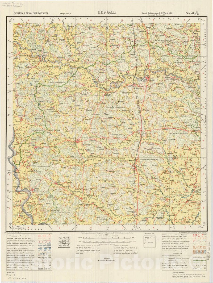Map : Bankura & Midnapore Districts, Bengal, No. 73 N/N.W. 1934, India and adjacent countries, Antique Vintage Reproduction