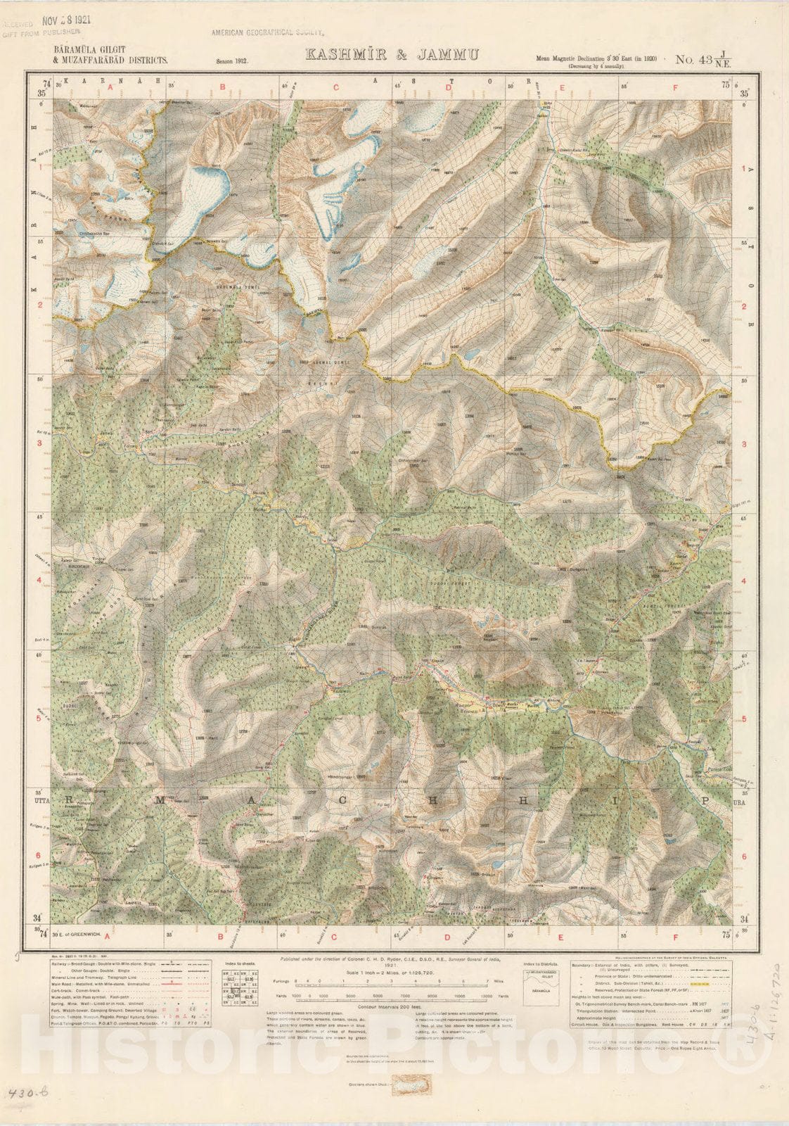 Map : Baramula Gilgit & Muzaffarabad Districts, Kashmir & Jammu, No. 43 J/N.E. 1921, India and adjacent countries, Antique Vintage Reproduction