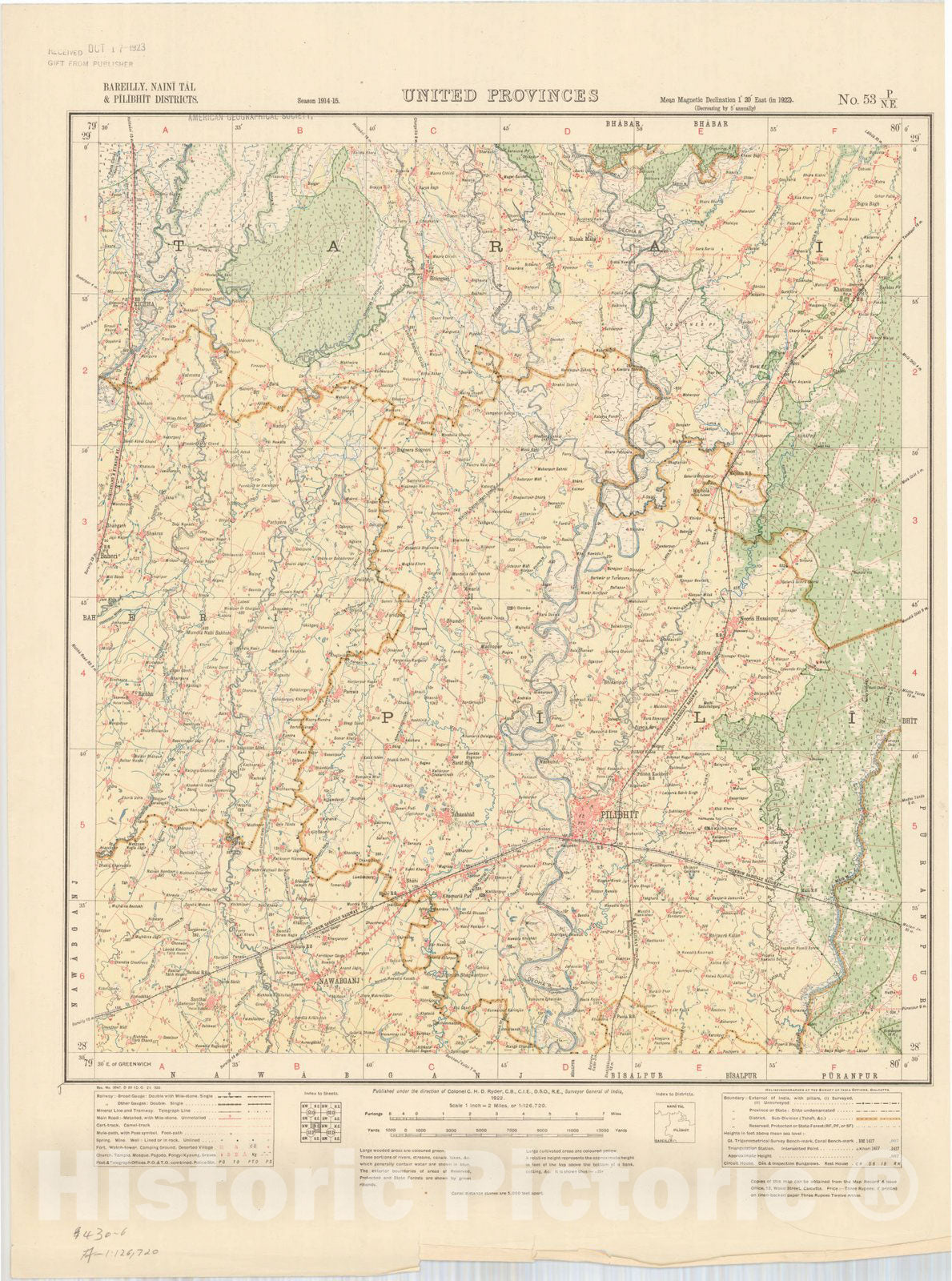 Map : Bareilly, Naini Tal & Pilibhit Districts, United Provinces, No. 53 P/N.E. 1922, India and adjacent countries, Antique Vintage Reproduction