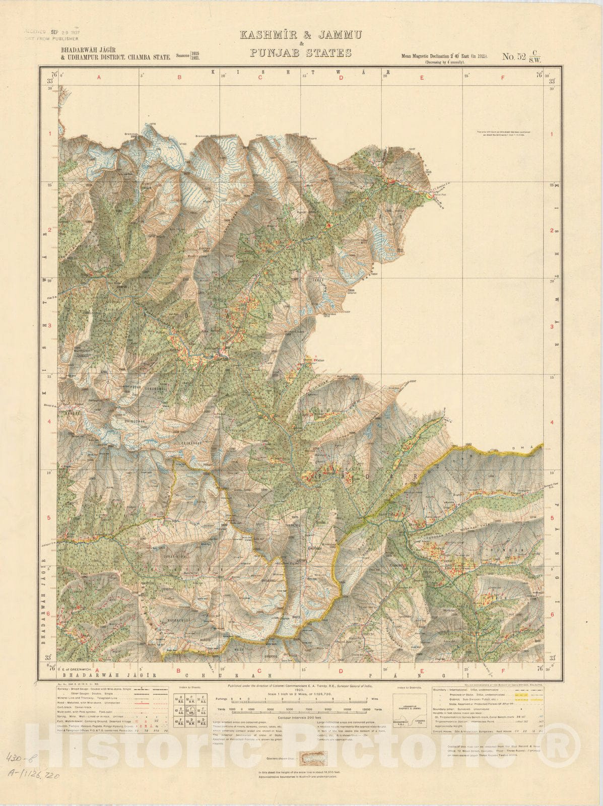 Map : Bhadarwah Jagir, Gurdaspur District, Chamba State, Kashmir & Jammu, Punjab & Punjab States, No. 52 C/S.W. 1925, India and adjacent countries