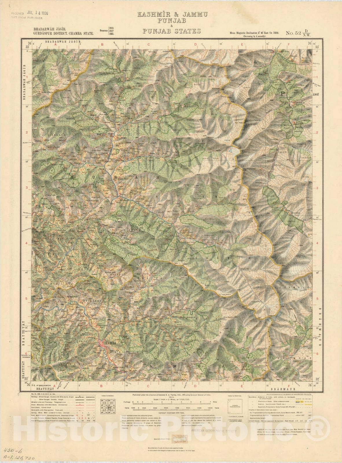 Map : Bhadarwah Jagir, Gurdaspur District, Chamba State, Punjab & Punjab States, No. 52 D/N.W. 1924, India and adjacent countries, Antique Vintage Reproduction