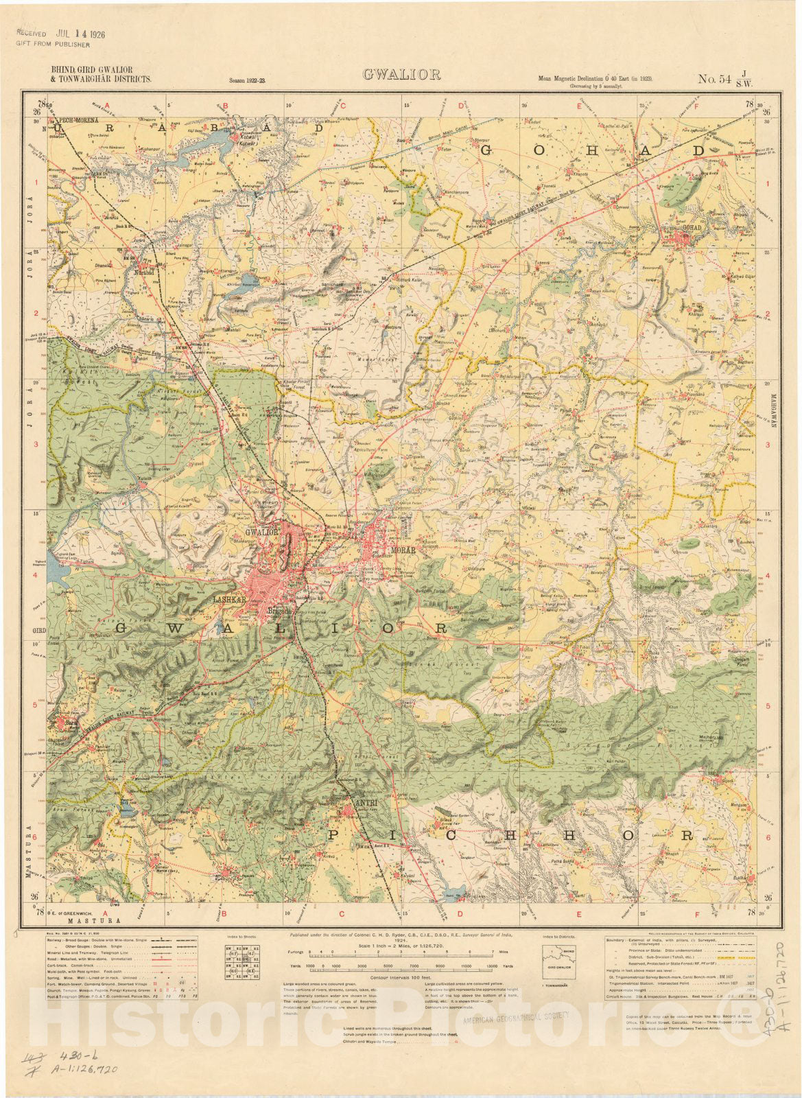 Map : Bhind, Gird Gwalior & Tonwarghar Districts, Gwalior, No. 54 J/S.W. 1924, India and adjacent countries, Antique Vintage Reproduction
