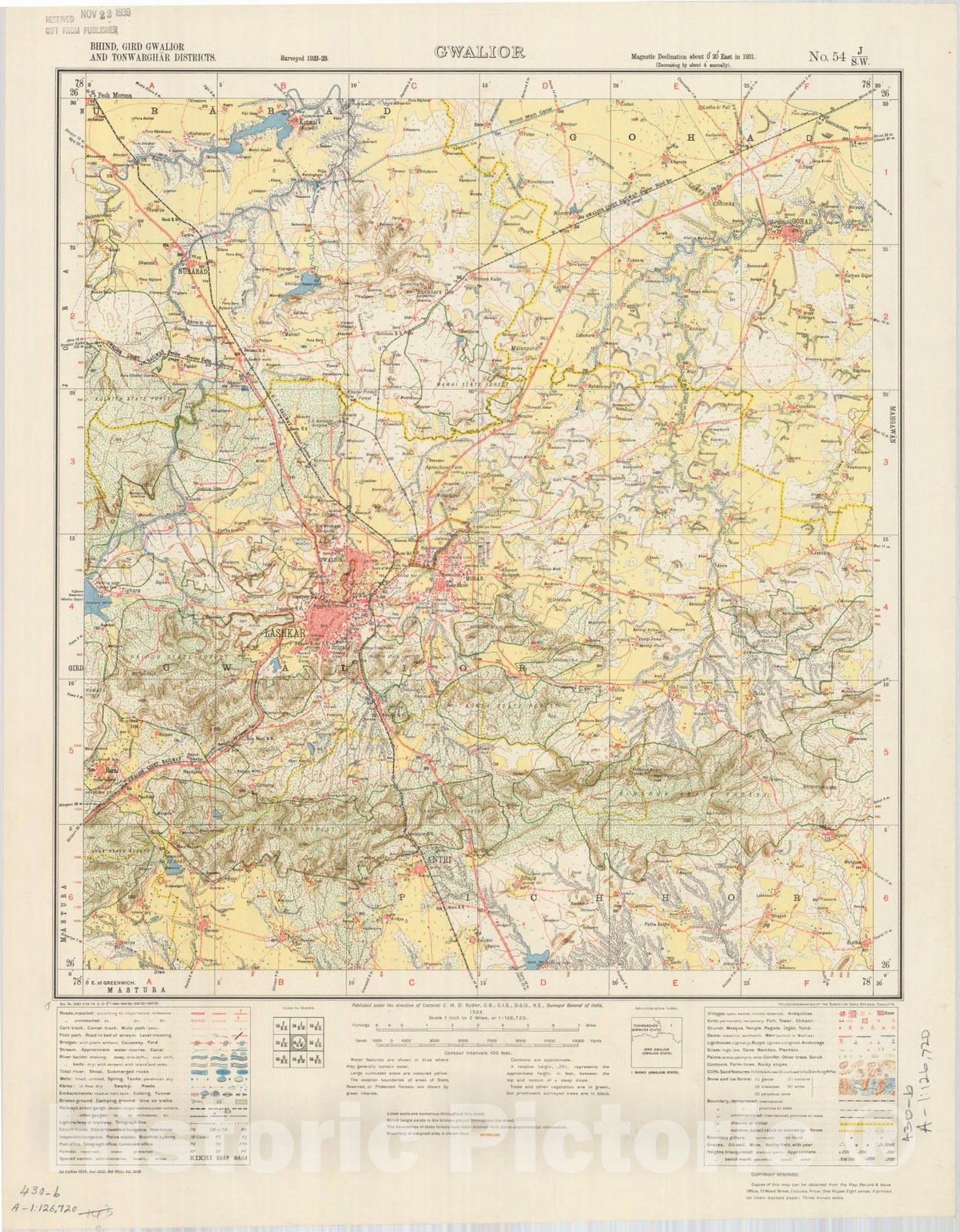 Map : Bhind, Gird Gwalior & Tonwarghar Districts, Gwalior, No. 54 J/S.W. 1939, India and adjacent countries, Antique Vintage Reproduction