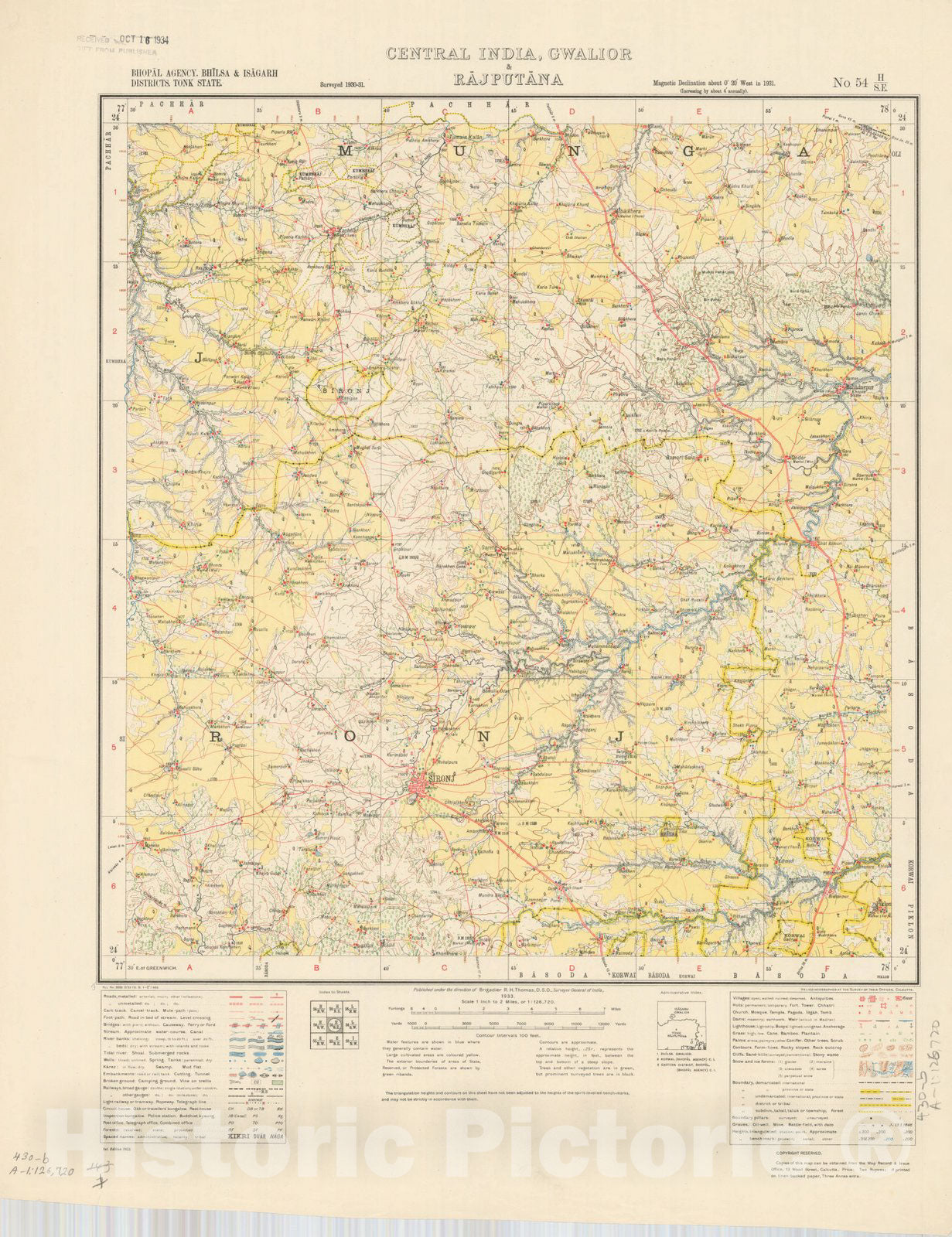 Historic Map : Bhopal Agency, Bhilsa & Isagarh Districts, Tonk STate, Central India, Gwalior & Rajputana, No. 54 H/S.E. 1933, India and adjacent countries, Antique Vintage Reproduction