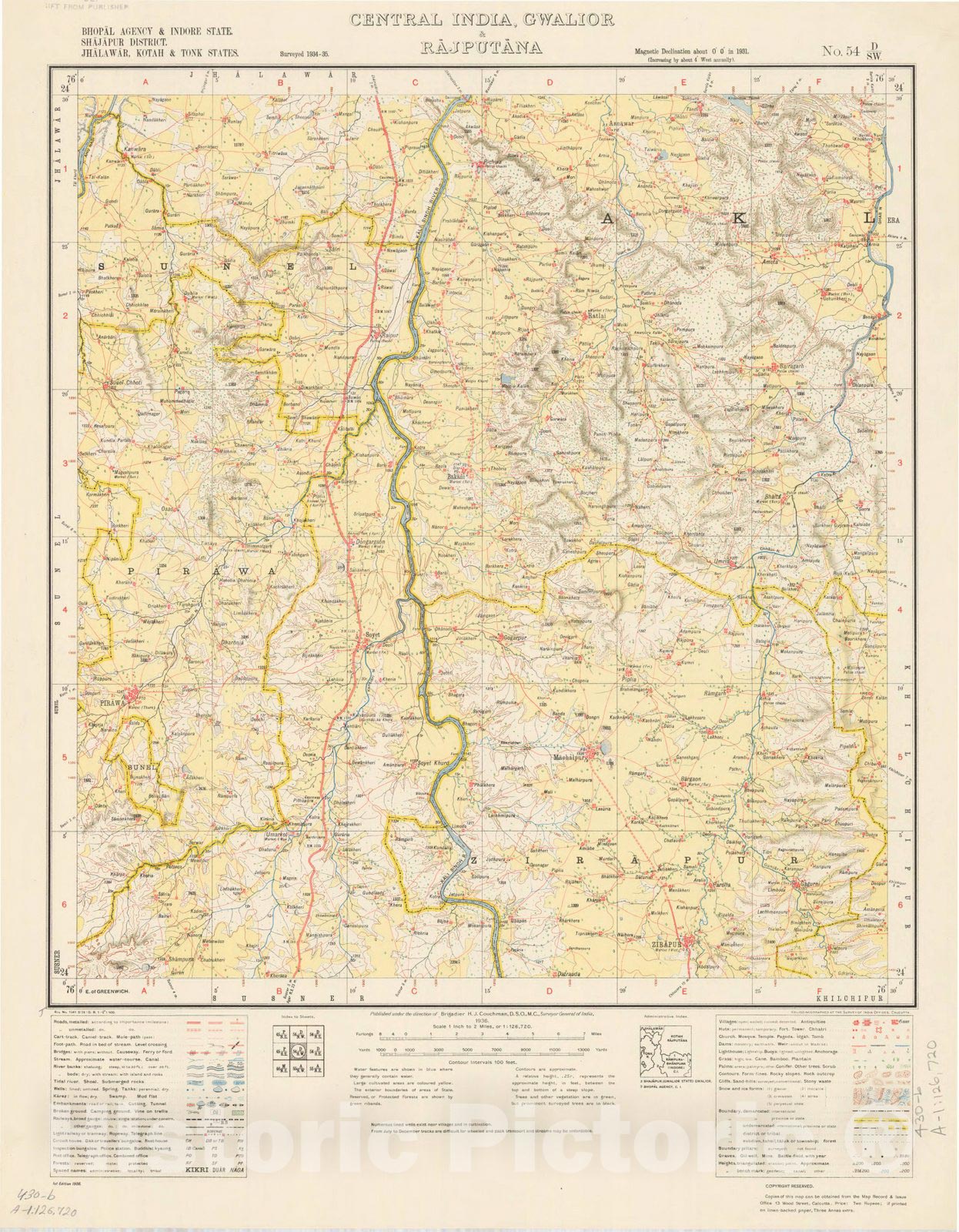 Map : Bhopal Agency & Indore State, Shajapur District, Jhalawar, Kotah & Tonk States, Central India, Rajputana, No. 54 D/S.W. 1936, India and adjacent countries