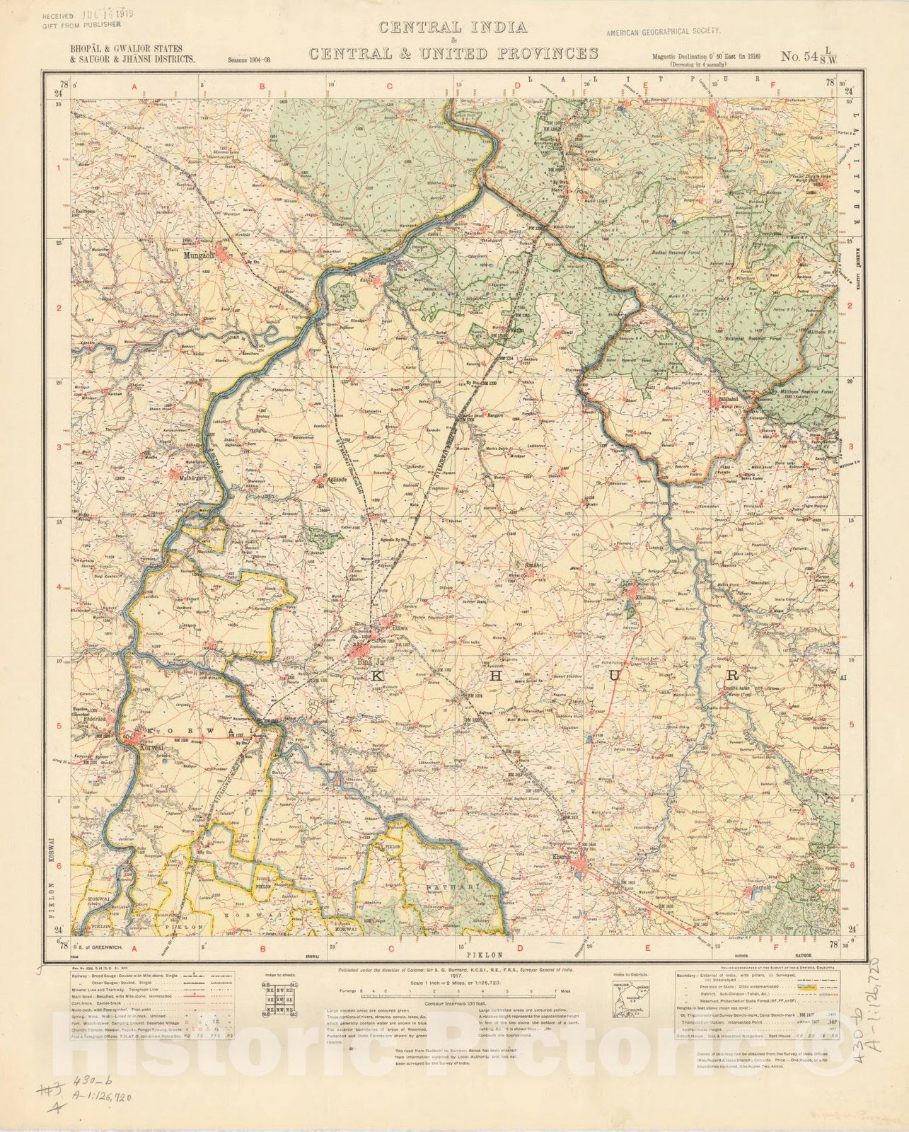 Map : Bhopal & Gwalior States & Saugor & Jhansi Districts, Central India & Central & United Provinces, No. 54 L/S.W. 1917, India and adjacent countries