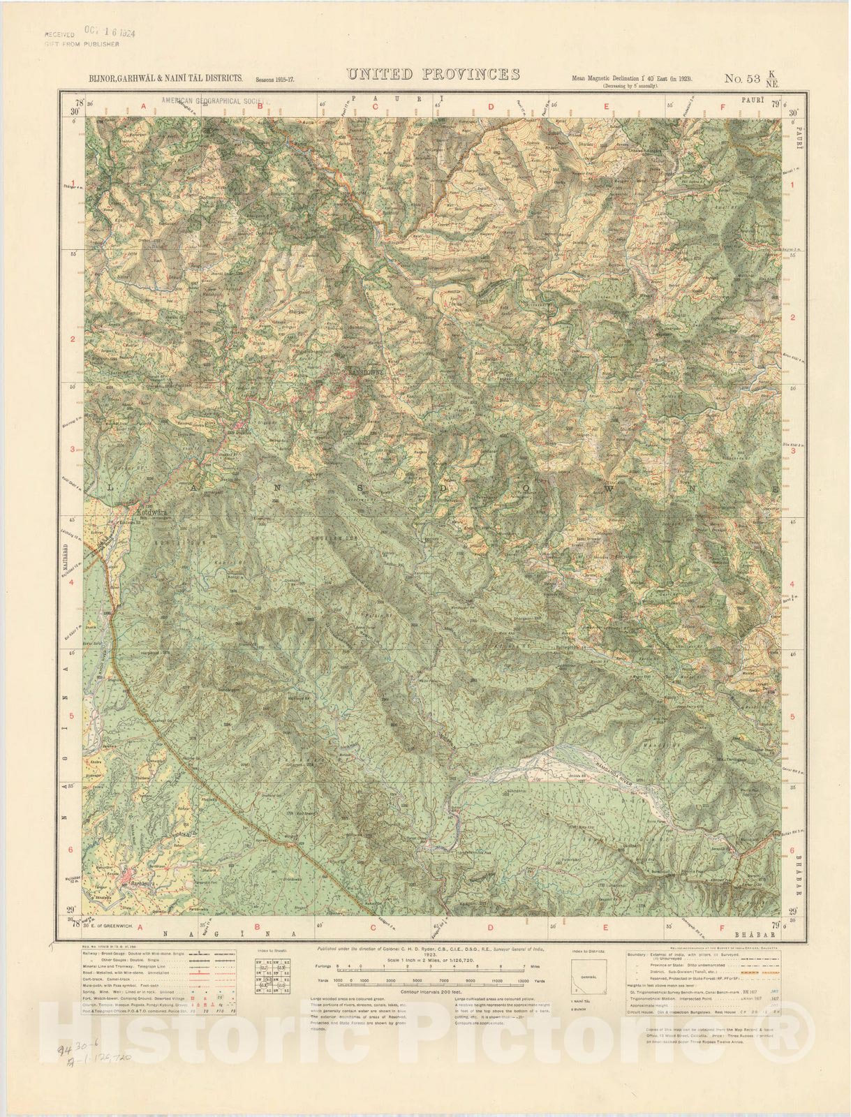 Map : Bijnor, Garhwal & Naini Tal Districts, United Provinces, No. 53 K/N.E. 1923, India and adjacent countries, Antique Vintage Reproduction