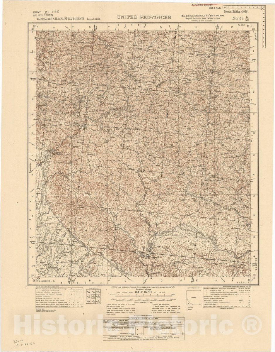 Map : Bijnor, Garhwal & Naini Talk Districts, United Provinces, No. 53 K/N.E. 1943, India and adjacent countries, Antique Vintage Reproduction