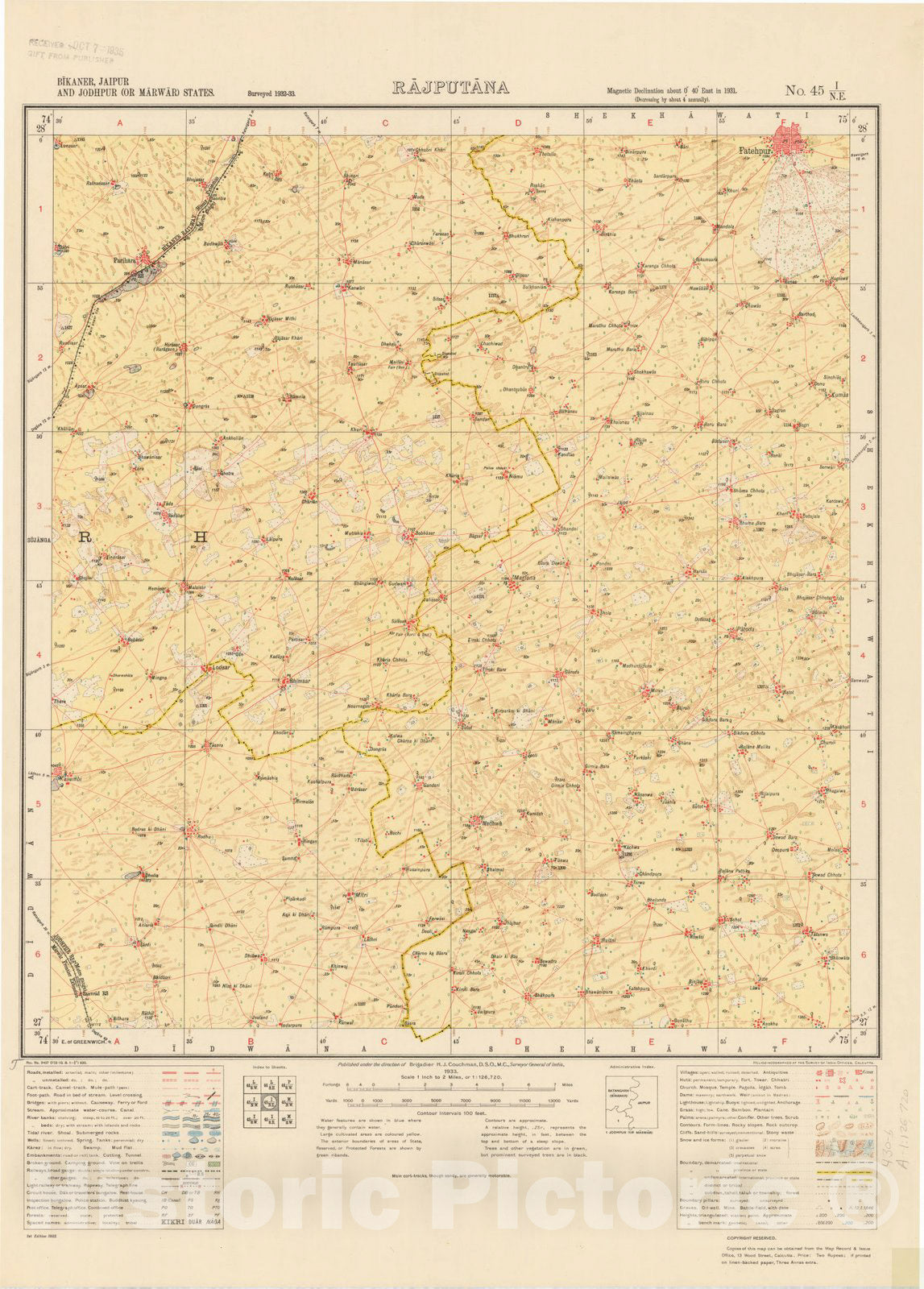 • .Map : Bikaner, Jaipur and Jodhpur (or Marwar) States, Rajputana, No. 45 I/N.E. 1933, India and adjacent countries, Antique Vintage Reproduction