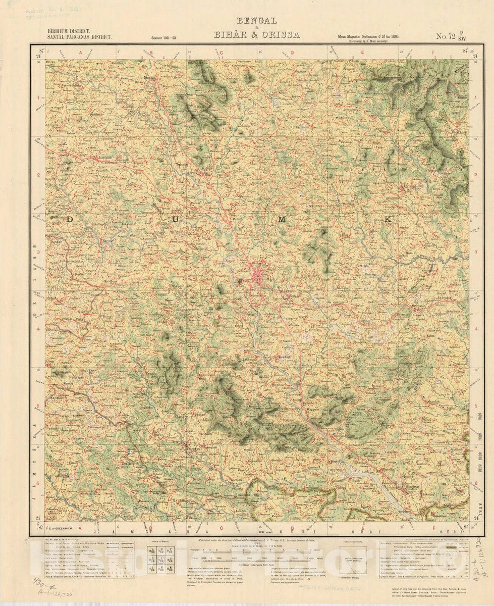 • Map : Birbhum District, Santal Parganas District, Bengal & Bihar & Orissa, No. 72 P/S.W. 1925, India and adjacent countries, Antique Vintage Reproduction