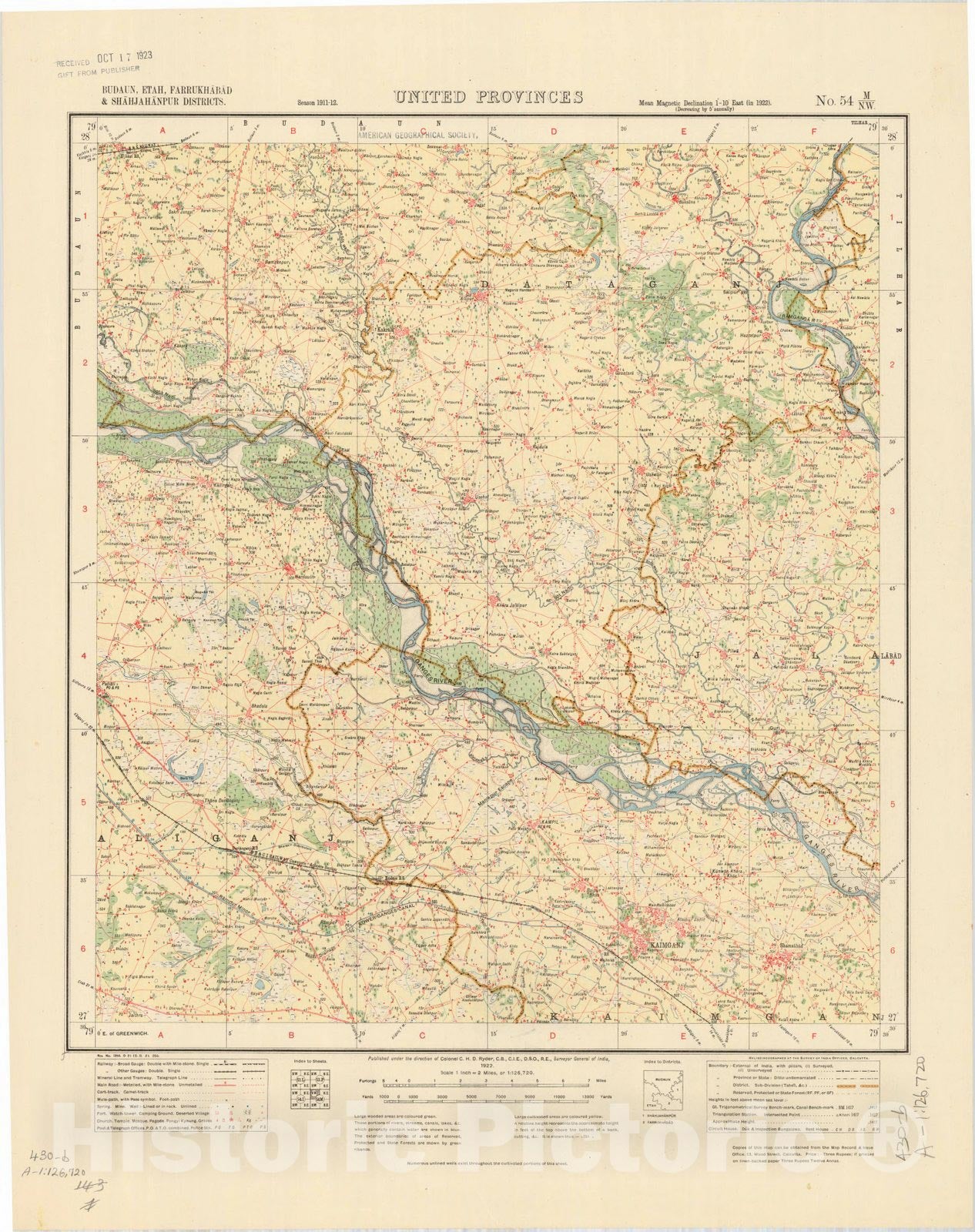 • .Map : Budaun, Etah, Farrukhabad & Shahjahanpur Districts, United Provinces, No. 54 M/N.W. 1922, India and adjacent countries, Antique Vintage Reproduction