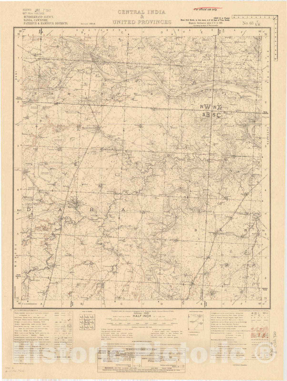 Map : Bundelkhand Agency, Banda, Cawnpore, Fatehpur & Hamirpur Districts, Central India & United Provinces, No. 63 C/N.W. 1943, India and adjacent countries