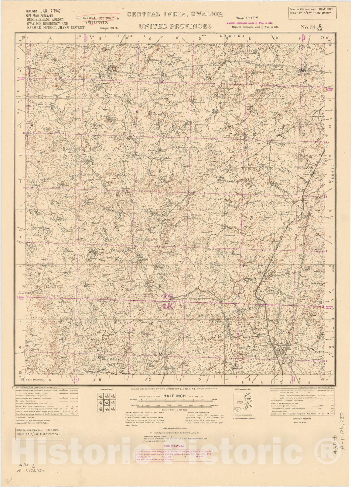 Historic Map : Bundelkhand Agency, Gwalior Residency and Narwar District, Jhansi District, Central India, Gwalior, United Provinces, No. 54 K/S.W. 1944, India and adjacent countries