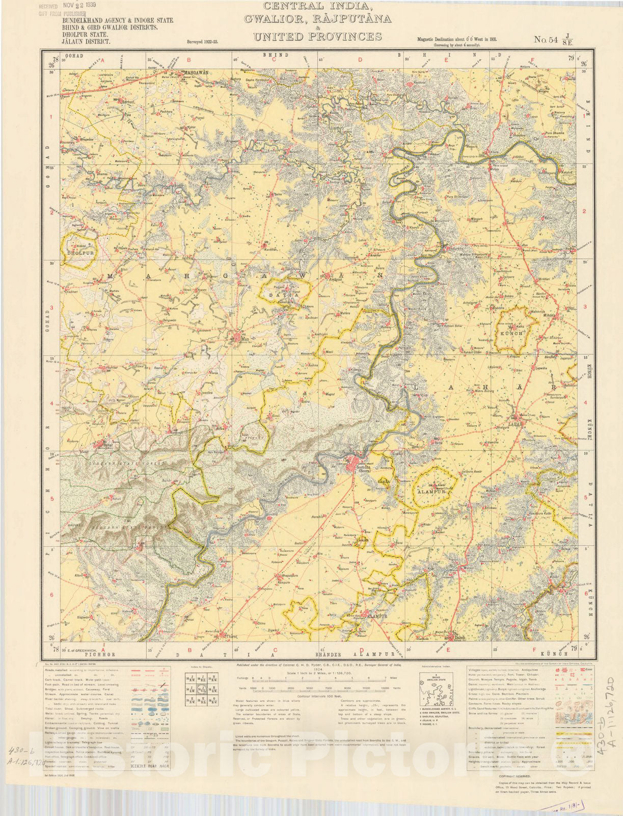 Map : Bundelkhand Agency & Indore State, Bhind & Gird Gwalior Districts, Gwalior, Rajputana & United Provinces, No. 54 J/S.E. 1938, India and adjacent countries