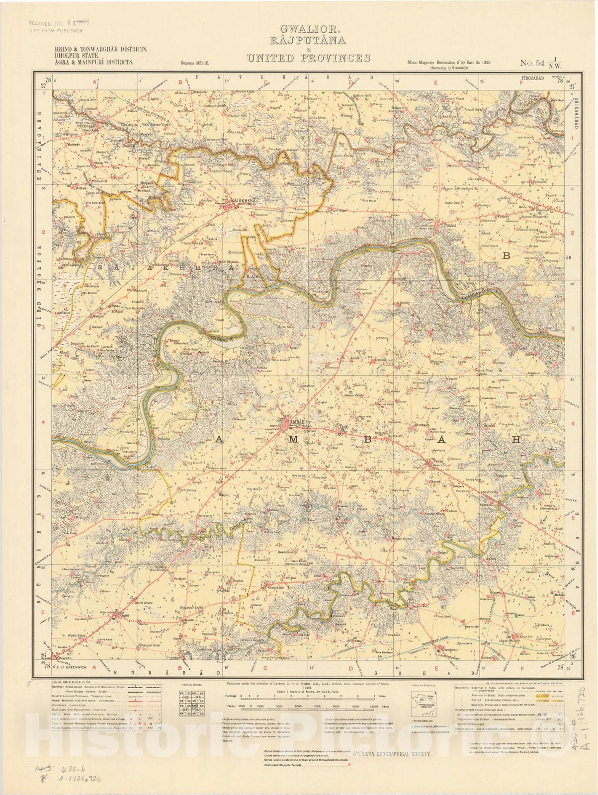 Map : Bundelkhand Agency & Indore State, Bhind, Jalaun Districts, Central India, Gwalior, Rajputana & United Provinces, No. 54 J/W.E. 1924, India and adjacent countries