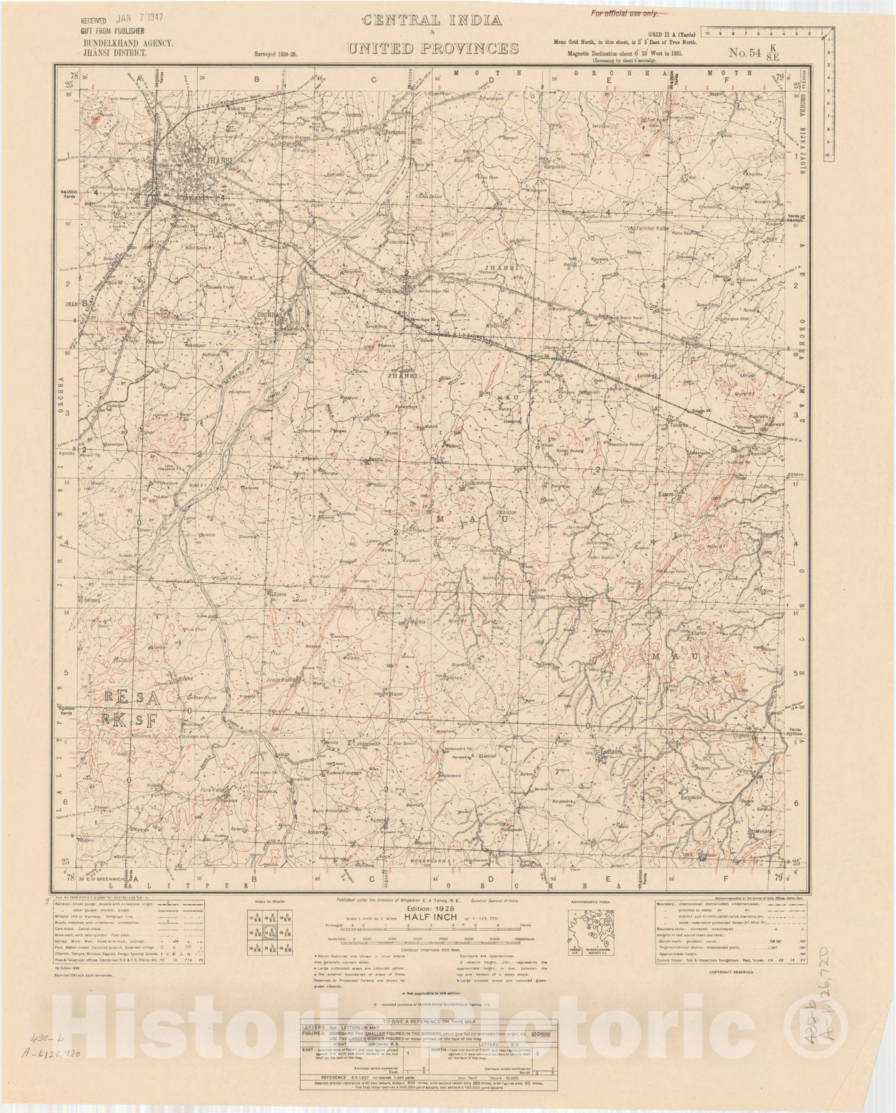 Map : Bundelkhand Agency, Jhansi District, Central India & United Provinces, No. 54 K/S.E. 1943, India and adjacent countries, Antique Vintage Reproduction