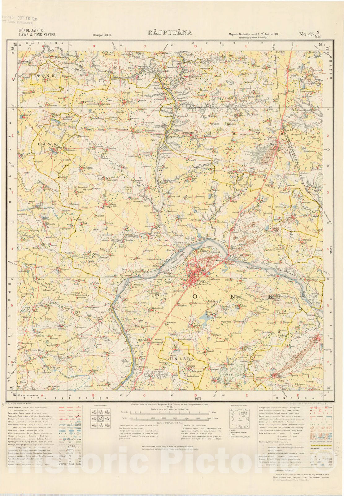 Map : Bundi, Jaipur, Lawa & Tonk States, Rajputana, No. 45 N/S.E. 1933, India and adjacent countries, Antique Vintage Reproduction