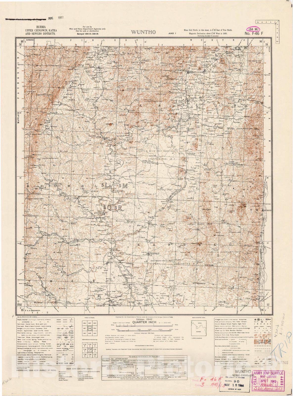 • Map : Burma, Upper Chindwin, Katha and Shwebo Districts, Wuntho, 84 M 1942, India 1:253,440, Antique Vintage Reproduction