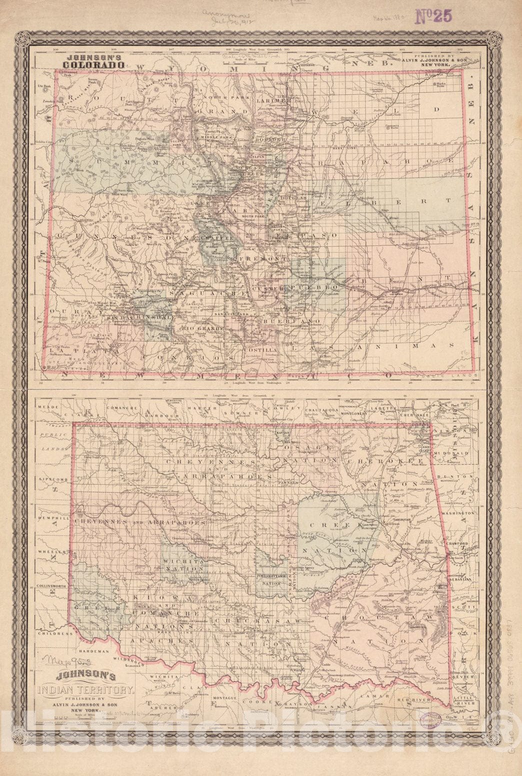 • .Historical Map, ca. 1880 Johnson's Colorado ; Johnson's Indian Territory, Vintage Wall Art